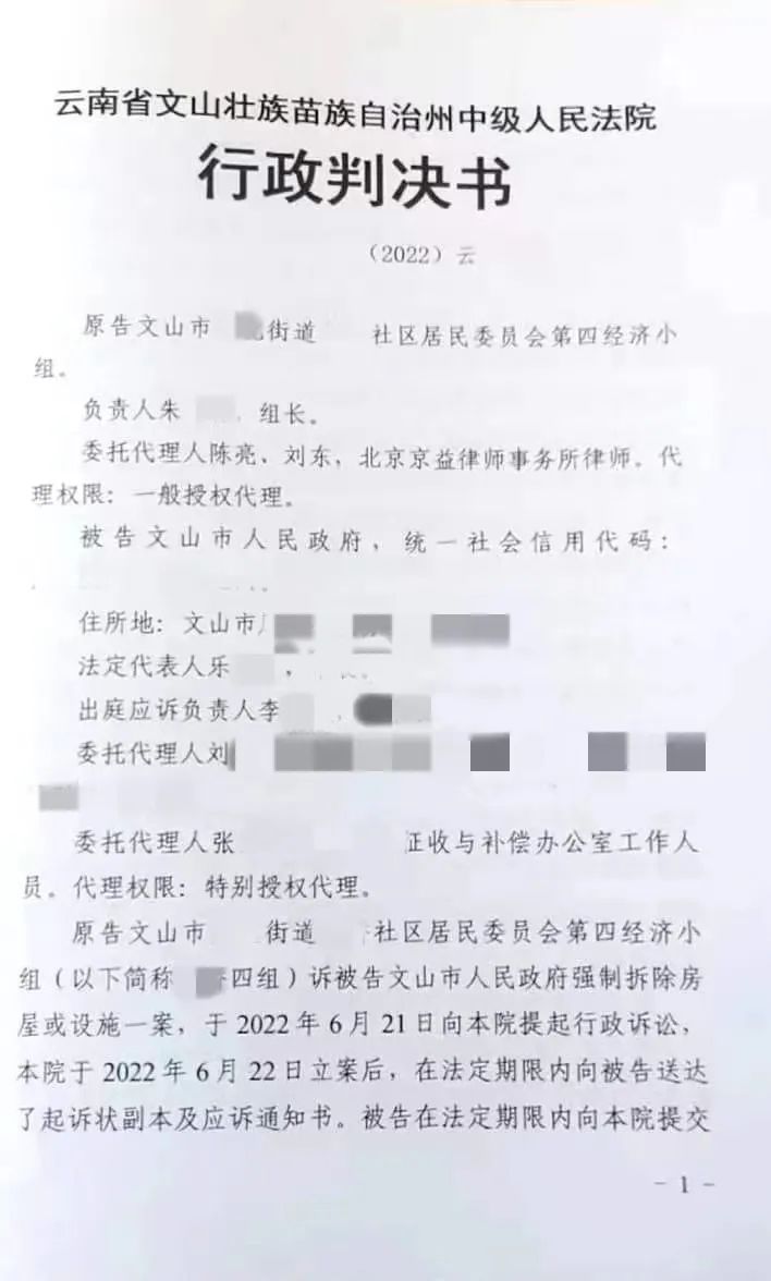 文山市XX街道XX社区居民委员会第四经济小组在当地拥有房屋,并办理了国有土地使用权证和房屋所有权证。2017年因文山市建设街片区棚户区改造项目,房屋被纳入征收范围。因2022年4月19日,市政府将案涉房屋强制拆除,经小组内一致决定委托北京京益律师事务所—德凯征地拆迁律师团开展法律维权工作。
