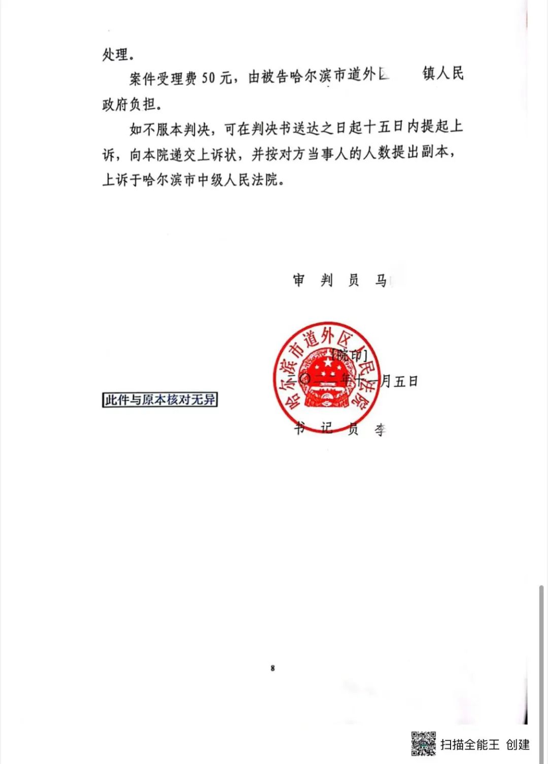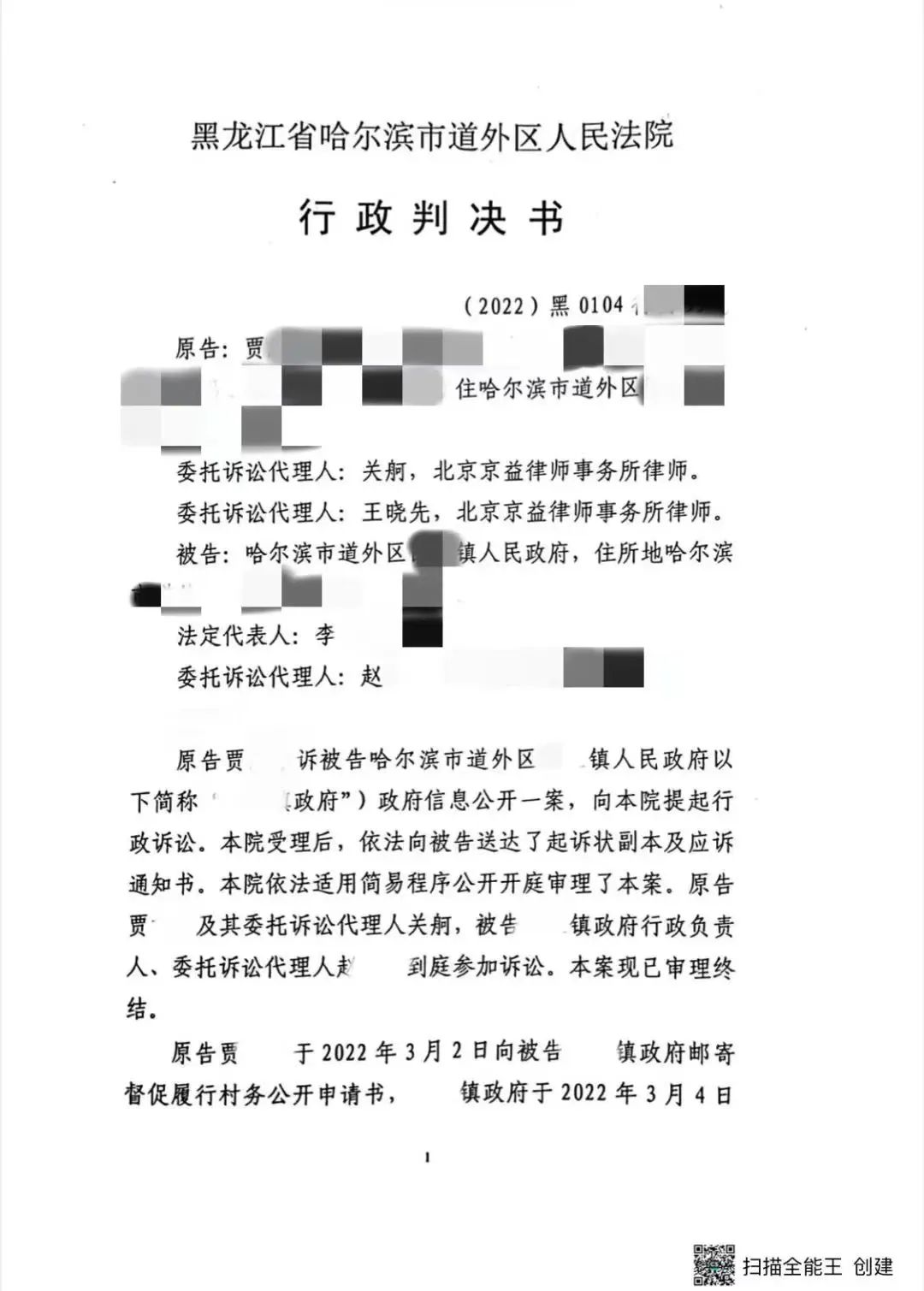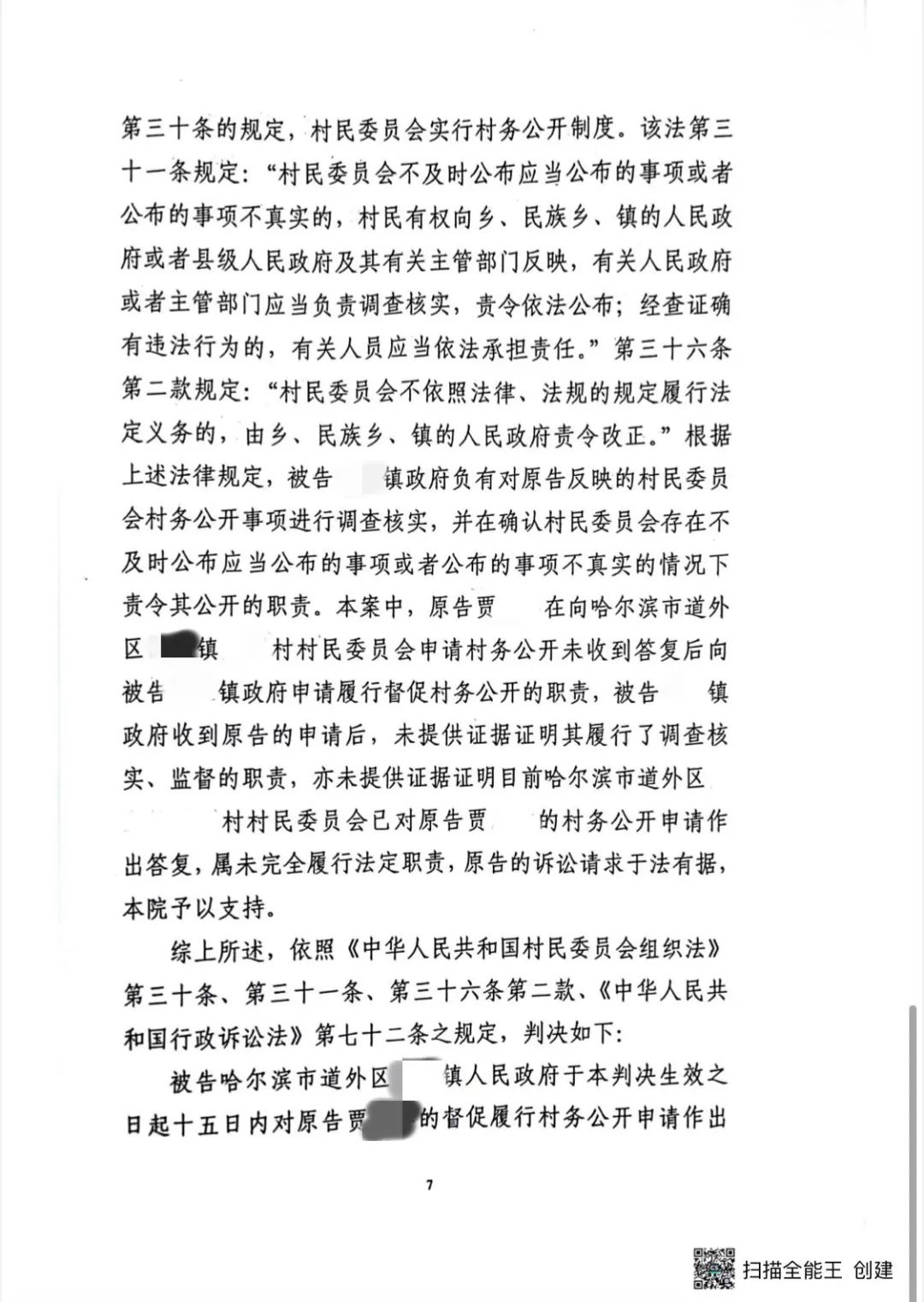 判决被告哈尔滨市道外区XX镇人民政府于本判决生效起十五日内对原告贾XX的督促履行村务公开申请作出处理。