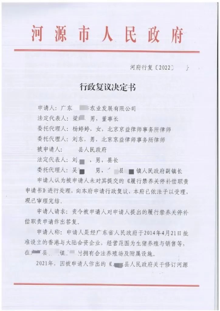 申请人是经广东省人民政府2014年4月21日批准设立的香港与大陆合资企业,经营范围为生猪养殖与销售等,在位于广东省河源市XX村拥有合法养殖场及附属设施。2021年,因《XX县人民政府关于修订河源市XX县畜禽养殖禁养区划定方案的决定》,案涉养殖场被纳入东江流域禁养区范围内。