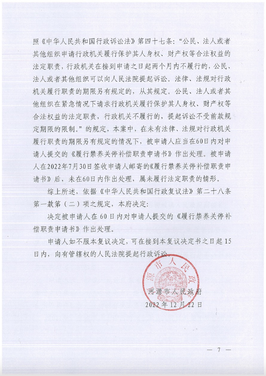 决定县政府在60日内对申请人提交的《履行禁养关停补偿职责申请书》作出处理。