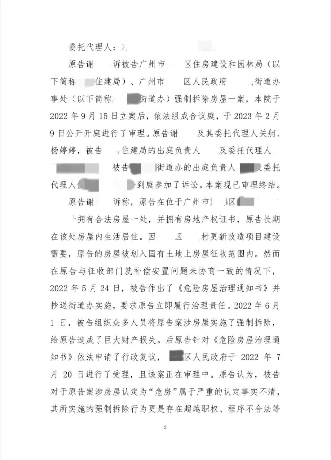 二位律师认为,被告对原告案涉房屋认定为“危房”属于严重的认定事实不清,其所实施的强制拆除行为更是存在超越职权,程序不合法等行为,遂以广州市XX区住房建设和园林局、广州市XX区人民政府XX街道办事处为被告依法提起行政诉讼。