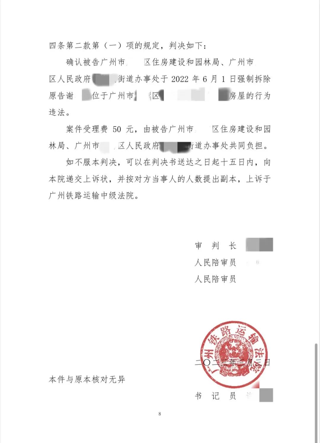 为维护自身合法权益,谢XX针对上述两行政机关所实施的强制拆除行为向广州铁路运输法院提起行政诉讼,请求确认该强制拆除行为违法。然而,二行政机关均否认参与实施了案涉强制拆除行为,辩称非本案适格被告,应驳回谢XX起诉。