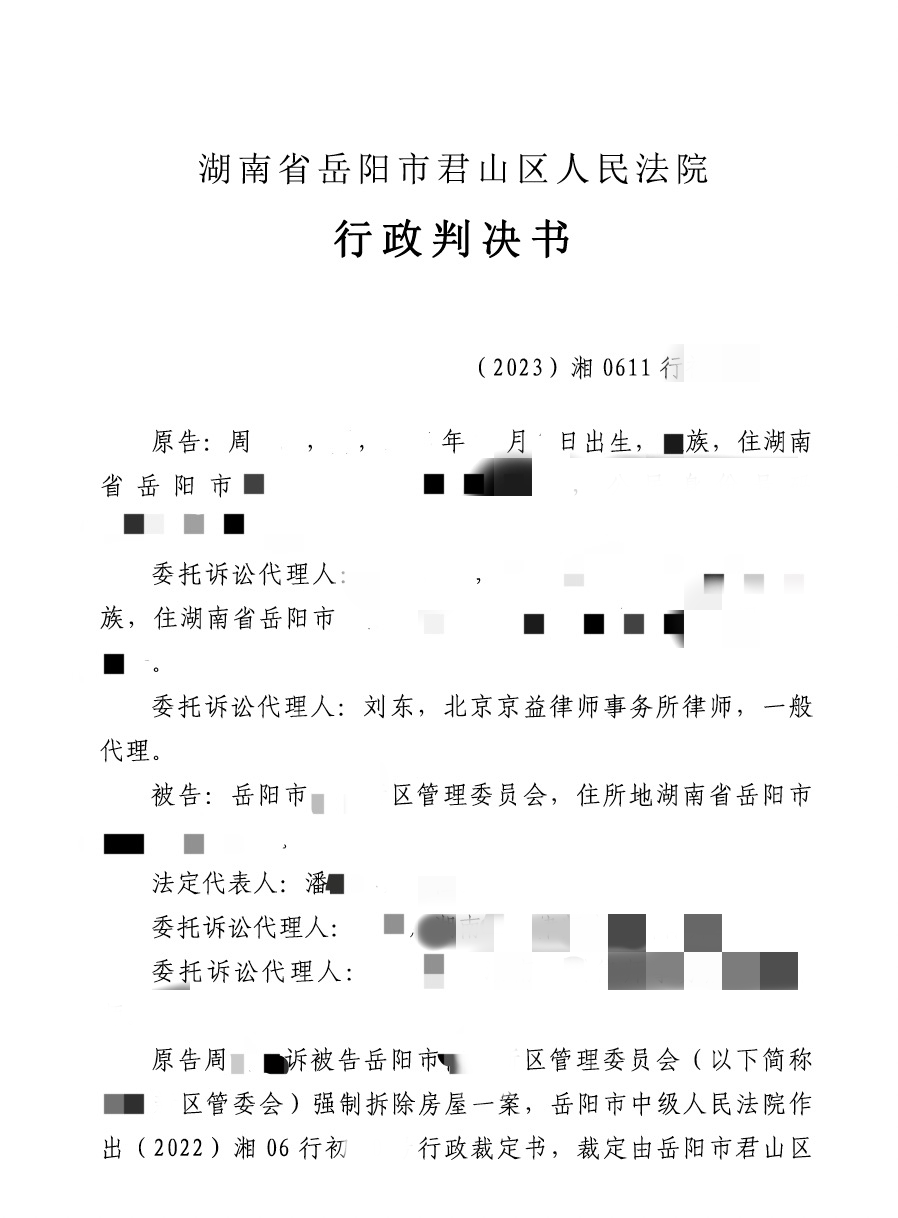 周某原为湖南省岳阳市XX村人,在本村拥有合法宅基地房屋居住生活,并办理了宅基地使用权证和房屋所有权证。2022年5月3日,管委会组织人员机械,对周某房屋实施了强制拆除,房屋物品全部毁损。周某为维护自身合法权益,遂委托北京京益律师事务所-德凯征地拆迁律师团开展法律维权工作。