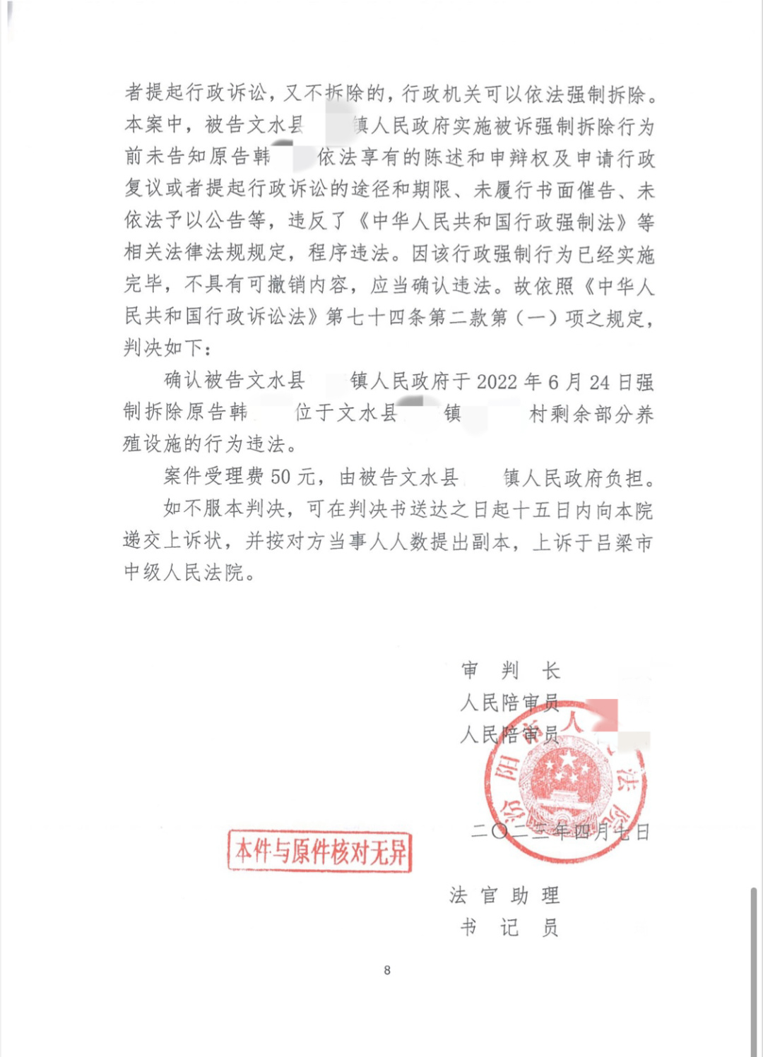 确认文水县XX镇人民政府强制拆除原告养殖设施的行为违法。