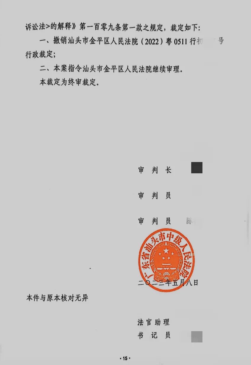 两位律师在提起诉讼后,一审法院以“不属于法院受案范围”为由,裁定驳回起诉。我方不服,提起上诉,现汕头中院作出二审行政裁定,撤销了一审裁定书,指令一审法院继续审理。