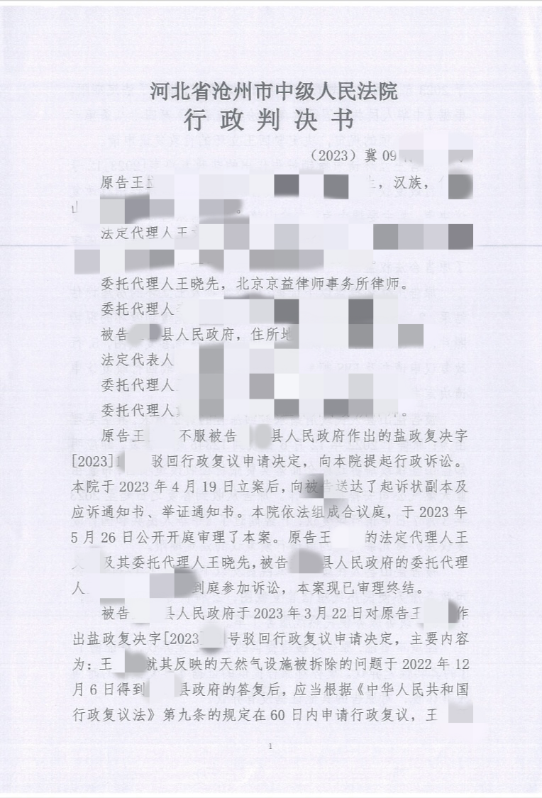 原告系河北省沧州市XX县XX村村民,在本村拥有合法房屋以满足基本居住生活。因“XX县XX村征收改造项目”的需要,原告的房屋被纳入拆迁范围。在原告与相关拆迁单位就房屋补偿安置未达成一致且未获取任何补偿安置利益情况下,2022年11月底,原告户的天然气设施在未进行任何通知下被强制拆除。