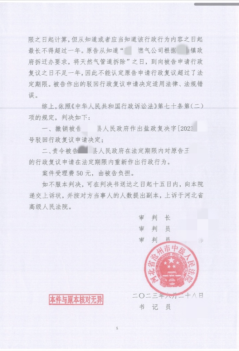 经原告向12345沧州市政务服务便民热线求助得知,天然气设施被强制拆除是被告要求天燃气公司实施,以推进整体拆迁。遂,原告依法向被告申请行政复议,被告以原告超过行政复议申请期限为由,驳回原告的行政复议申请。原告不服,诉至法院。