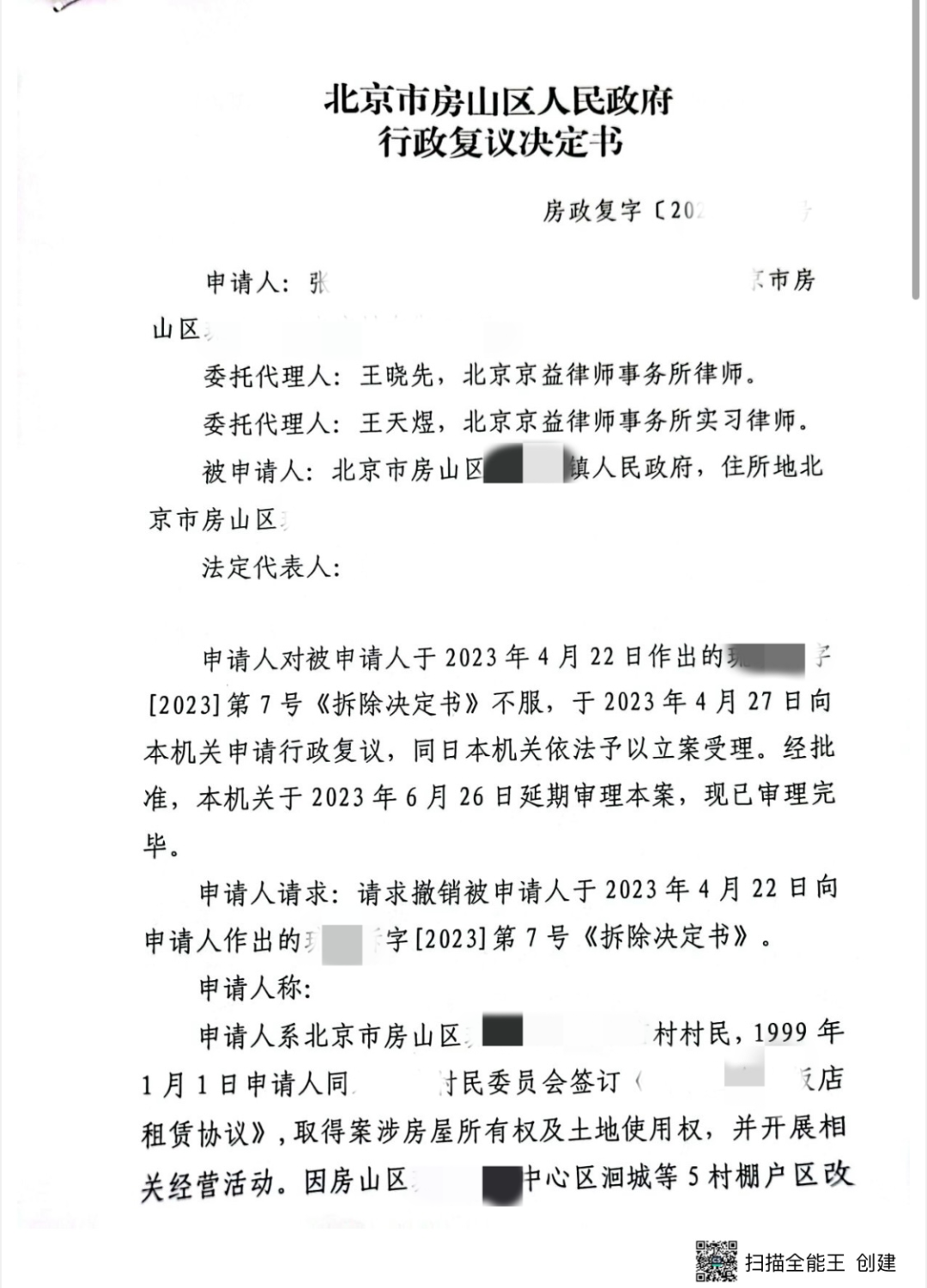 北京京益律师事务所-德凯征地拆迁律师团接受张某委托后,指派王晓先律师协助其开展法律工作。王律师在查阅案件材料后,协助张某依法向北京市房山区人民政府提起行政复议。