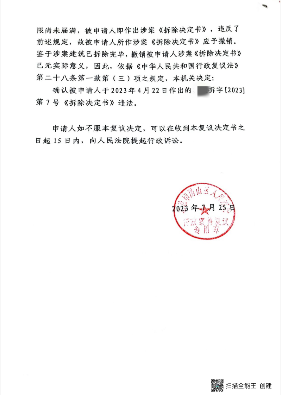【胜诉公告】诉讼期限尚未届满,即作出拆除决定,违法!