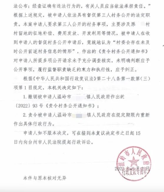 二、关于《责令村务公开通知书》是否正确的问题。《中华人民共和国村民委员会组织法》第三十一条规定:村民委员会不及时公布应当公布的事项或者公布的事项不真实的,村民有权向乡、民族乡、镇的人民政府或者县级人民政府及其有关主管部门反映,有关人民政府或者主管部门应当负责调查核实,责令依法公布;经查证确有违法行为的 , 有关人员应当依法承担责任 。” 根据上述规定,镇政府依法具有督促第三人村务公开的法定职责。