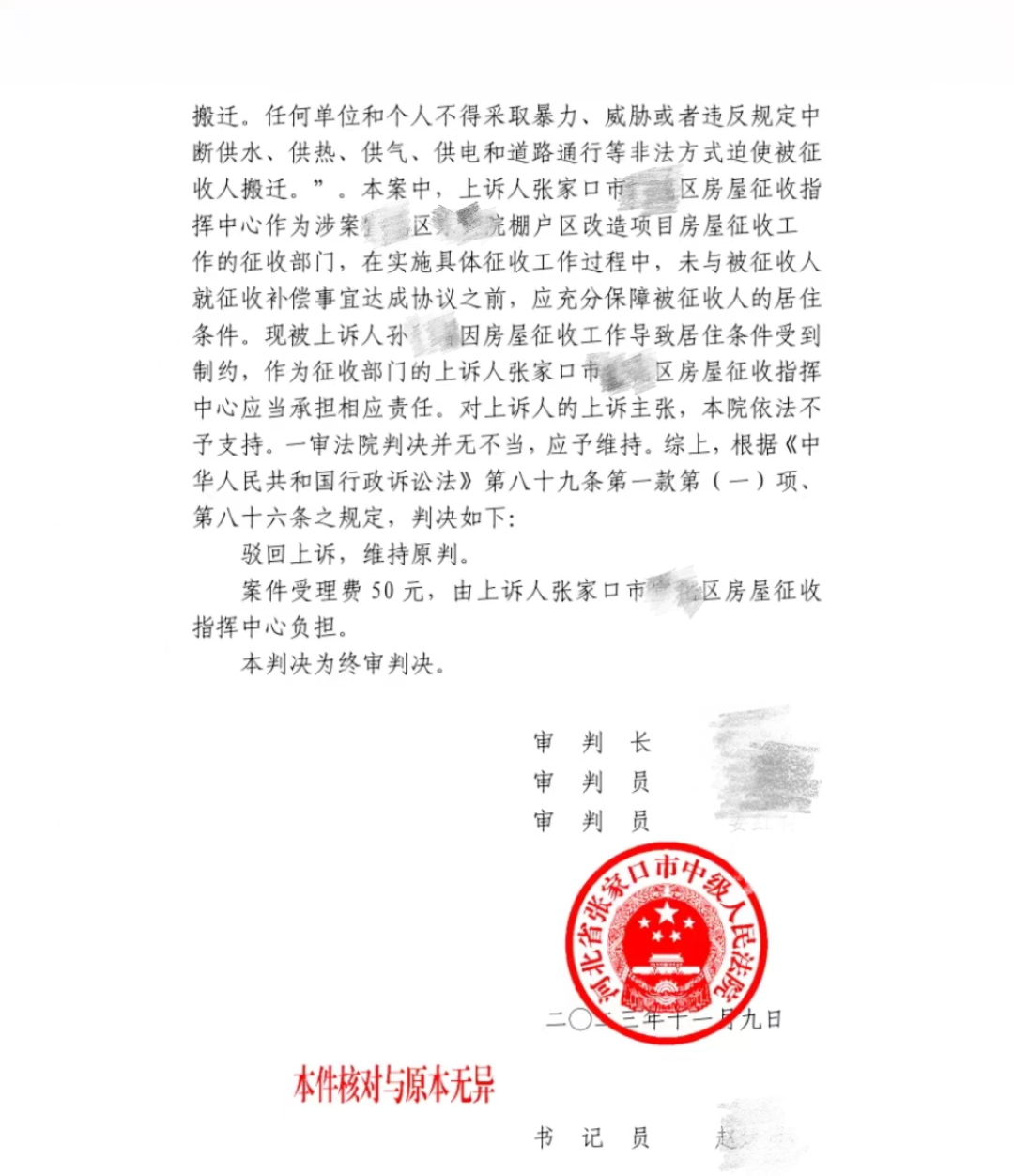 最终法院采纳了代理律师的建议,依法确认了被告断水、断电、断路、断气等行为违法,同时要求恢复相应供应,要坚决杜绝通过暴力逼迁行为。二审法院同样采纳了我方律师的观点驳回了对方上诉。