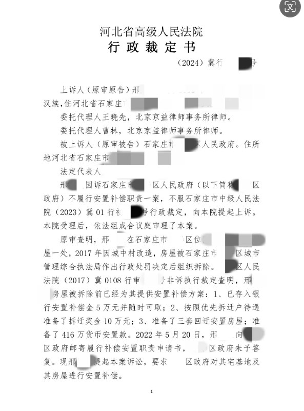 邢XX在石家庄市XX区有房屋一处,2017 年因城中村改造,房屋被石家庄市XX区城市管理综合执法局作出行政处罚决定后组织拆除。尽管XX区政府声称已提供了安置补偿方案,但邢某对此并不认可,并认为政府未依法履行补偿安置职责。
