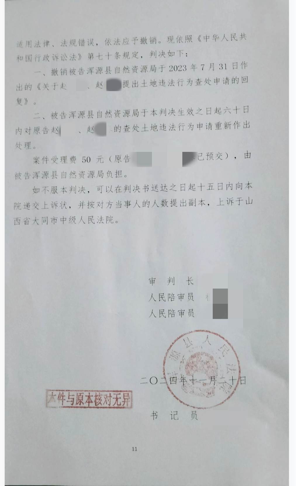 撤销被告浑源县自然资源局作出的《关于赵某二人提出土地违法行为查处申请的回复》。