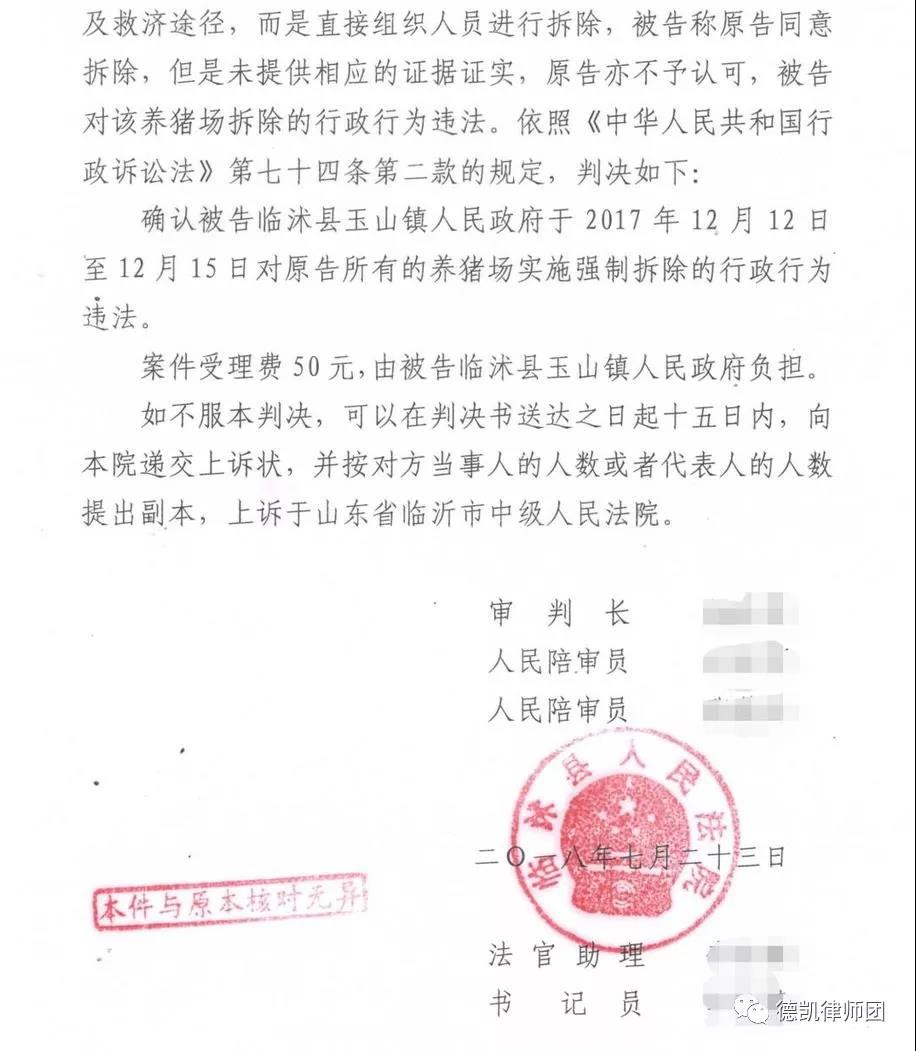 德凯团队接受委托后,指派刘光明律师参与案件。时间紧急,德凯立即协助委托人整理养殖场原貌照片、强拆现场视听证据及拆迁方下发的书面材料,并于2018年4月23日向临沭县人民法院提起诉讼。