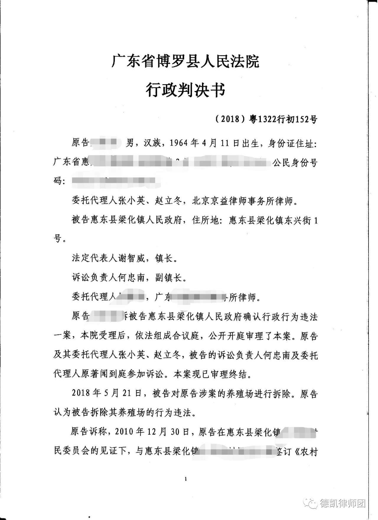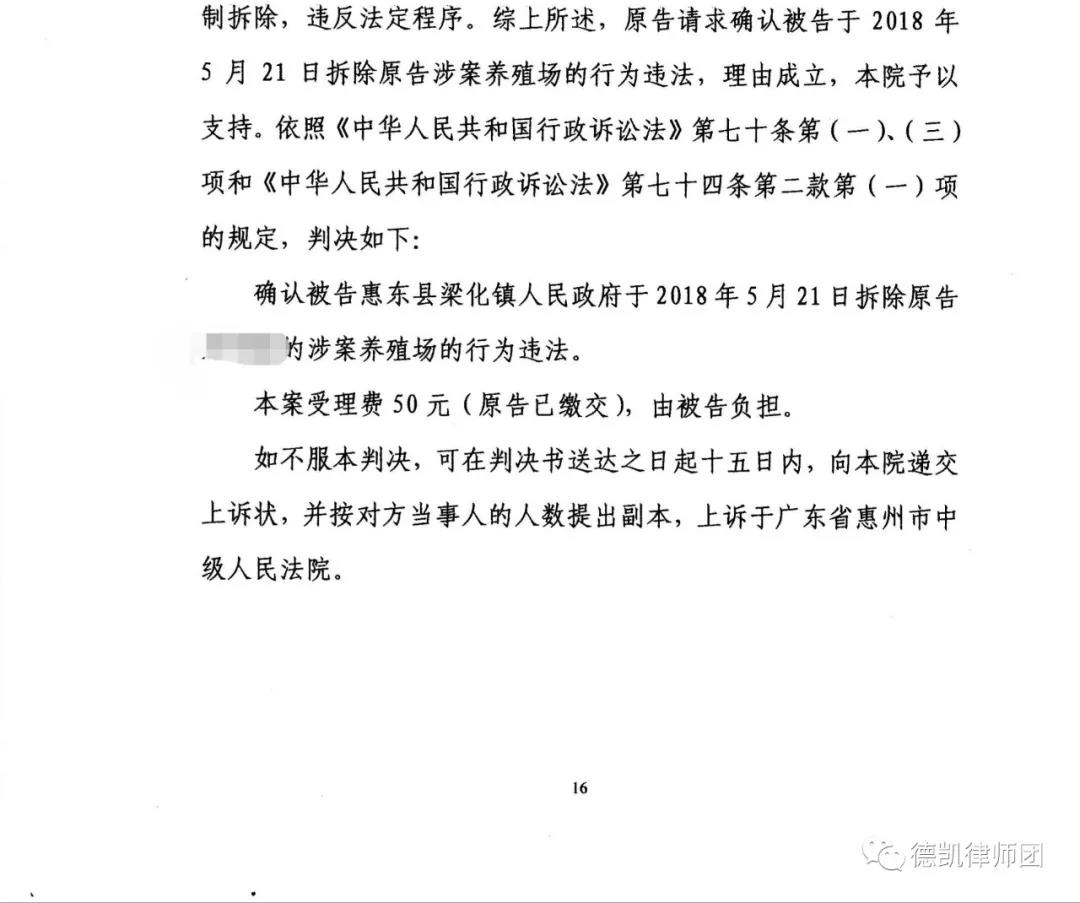 万先生在律师的指导下搜集了养殖场被强制拆除前照片,养殖场被强制拆除现场照片及拆除之后的照片。还有租赁协议,非禁养区需整治畜禽规模养殖场名单以及排污设施设备照片等证据委托张小英律师和赵立冬律师向广东省博罗县人民法院提起诉讼。在法庭上,被告方提出了各类通告通知书及文件规定近26条,面对这么多罗列的证据,两位律师处事不惊,运用扎实的法律功底进行答辩。包括运用《中华人民共和国城乡规划法》、《广东省环境保护条列》、《中华人民共和国行政强制法》、《土地管理法》、《森林法》等相关法律法规。最终,法院支持了原告的诉讼请求。附带判决。