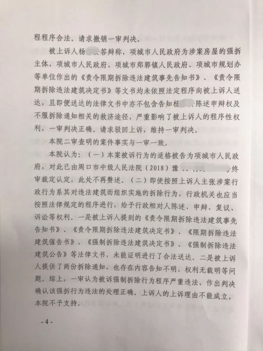 在二审法庭上,项城市人民政府继续辩称杨某房屋是“两违”建筑,不应受法律保护。并一直狡辩对杨某违法建筑的拆迁过程程序合法。