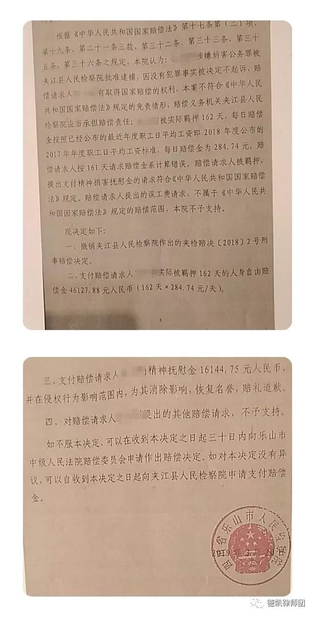 乐山市人民检察院经过审理,于2019年3月18日分别作出乐检刑申复决〔2019〕2号、乐检刑申复决〔2019〕3号《刑事申诉复查决定书》认定当事人无犯罪事实,于2019年3月20日分别作出乐检赔复决〔2019〕1号、乐检赔复决〔2019〕2号《刑事赔偿复议决定书》,决定撤销夹江县人民检察院作出的2、3号刑事赔偿决定,要求夹江县人民检察院分别支付当事人人身自由赔偿金46127.88元,精神抚慰金16144.75元,并在侵权范围内消除影响、恢复名誉、赔礼道歉。