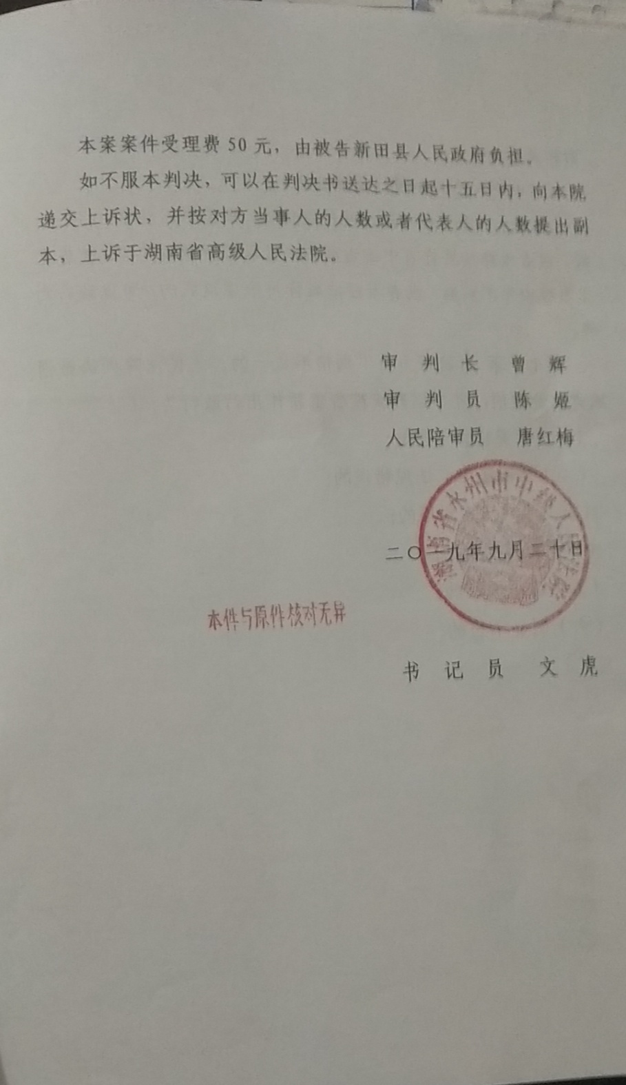 撤销被告新田县人民政府于2019年7月12日作出新政复决字(2019)第3号行政复议决定