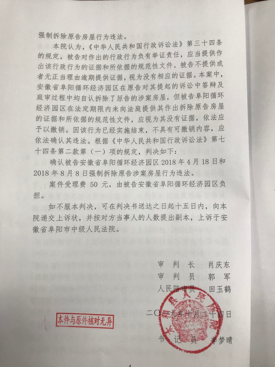 确认被告安徽省阜阳循环经济园区2018年4月18日和2018年8月8日强制拆除原告涉案房屋行为违法。
