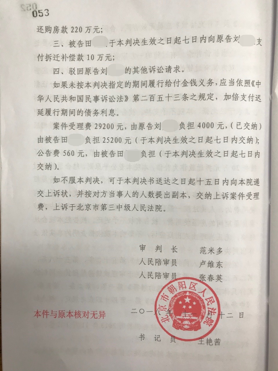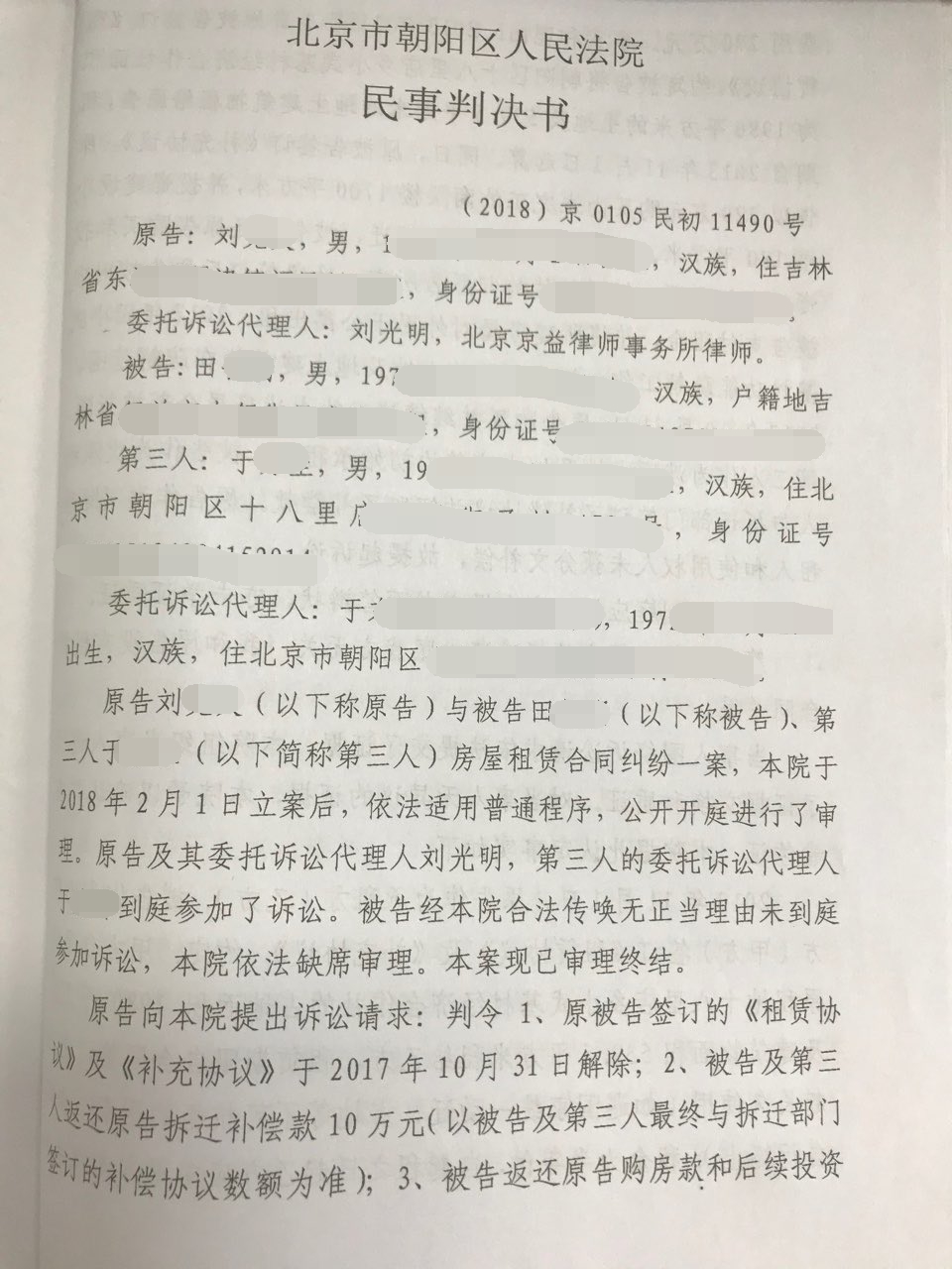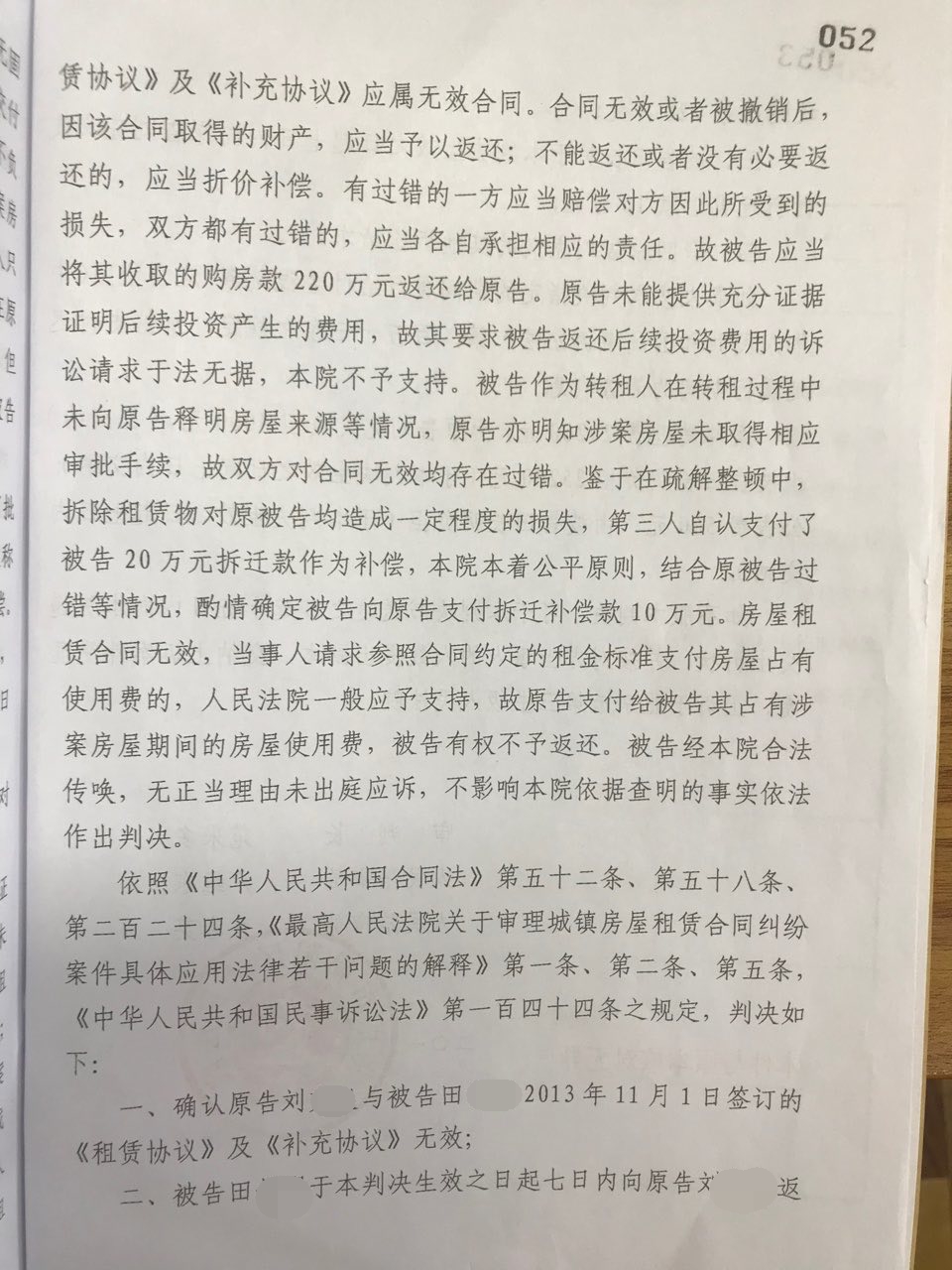 鉴于田某消失不见,最终朝阳区人民法院将起诉状副本等相关材料向田某公告送达。最终法院认定田某和刘某签订的《租赁协议》及《补充协议》无效,田某返还于某购房款220万元,并在判决生效后七日内向刘某支付拆迁补偿款10万元。