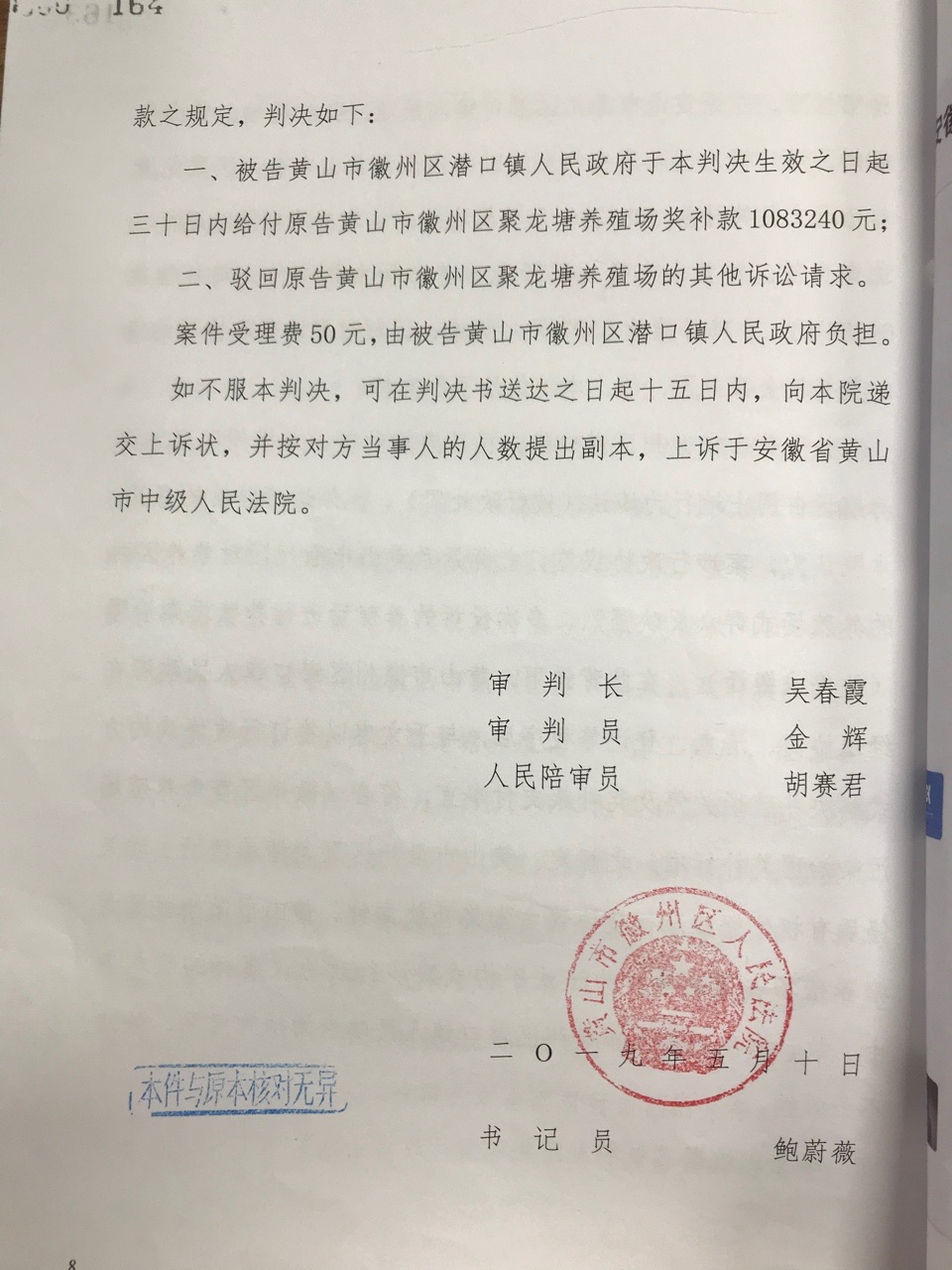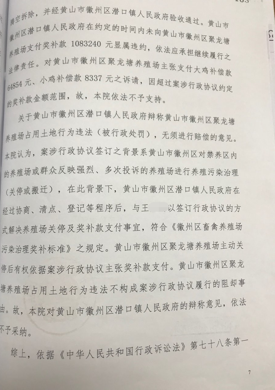 2019年5月,两位承办律师收到安徽省黄山市徽州区人民法院作出的履行行政协议一审判决书,判决被告潜口镇政府按照协议履行,向原告王先生养殖场支付1083240元。