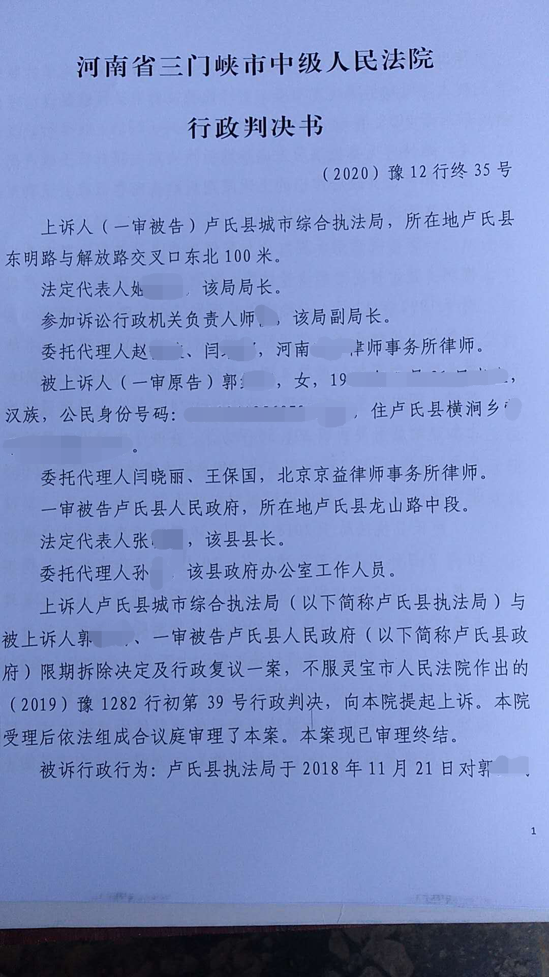 我方委派了闫晓丽、王保国两名律师负责郭女士家的维权工作。我方在先研判了案件情况之后,决定先提起行政复议,然后再起诉。向上级人民政府提起行政复议,未得到复议机关卢氏县人民政府的支持。因此我方向卢氏县人民法院起诉,主张政府的限期拆除决定和卢氏县政府的复议决定违法。一审胜诉。卢氏县执法局和卢氏县政府不服判决,向三门峡市中级人民法院提起上诉。