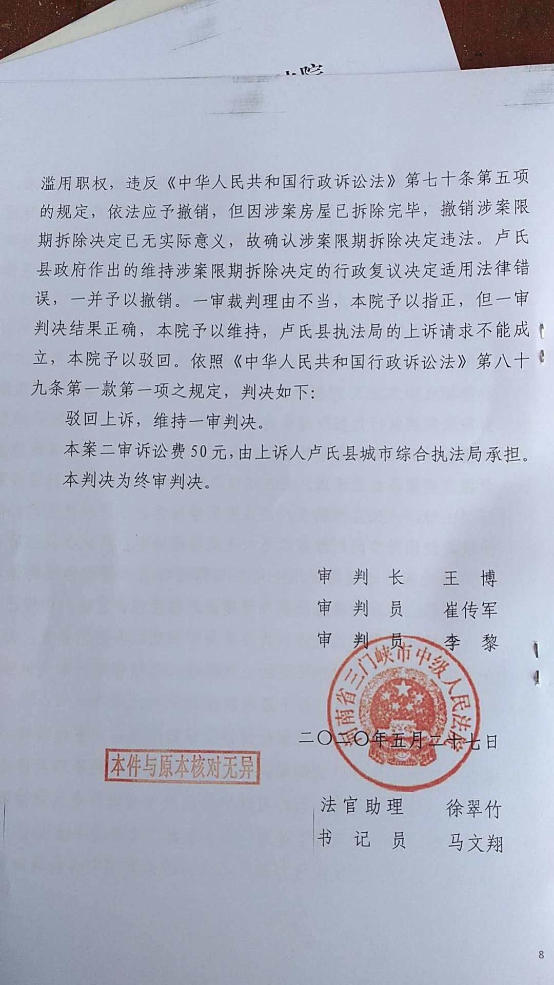 最终,三门峡市人民法院全盘支持了我方的诉讼请求。限期拆除决定书被撤销!对房屋执法的依据被排除之后,就有条件慢慢与政府协商补偿事宜了。