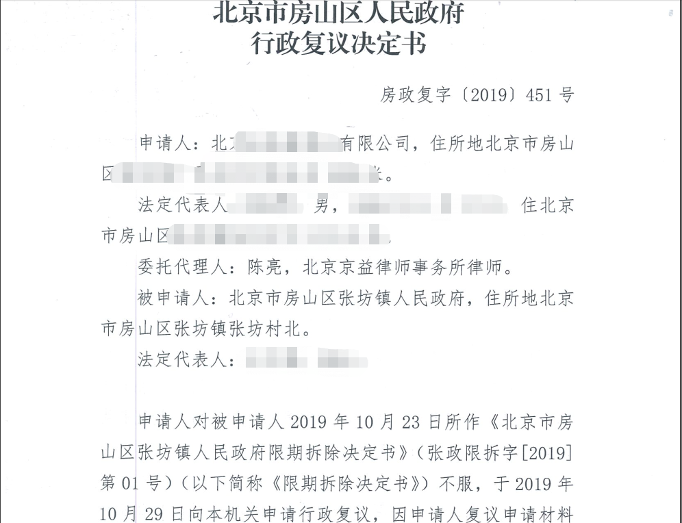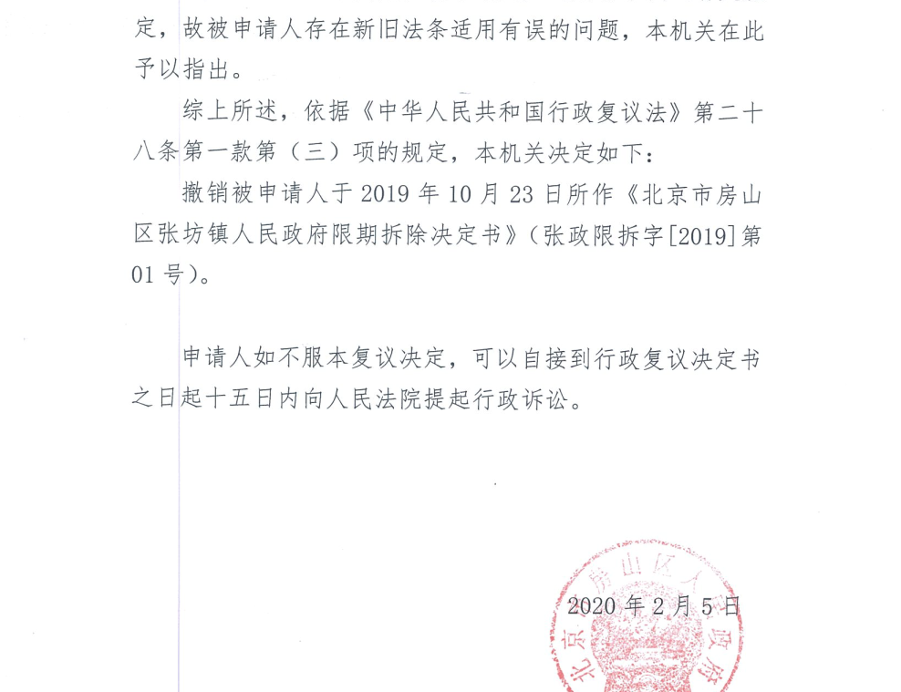 2020年2月5日,北京市房山区人民政府审理案件后认为张坊镇政府作出《限期拆除决定书》属事实认定不清,证据不足,程序上也不合法,故依据《中华人民共和国行政复议法》第二十八条第一款第(三)项的规定,决定撤销张坊镇政府于2019年10月23日做出的《北京市房山区张坊镇人民政府限期拆除决定书》(张政限拆字[2019]第01号)