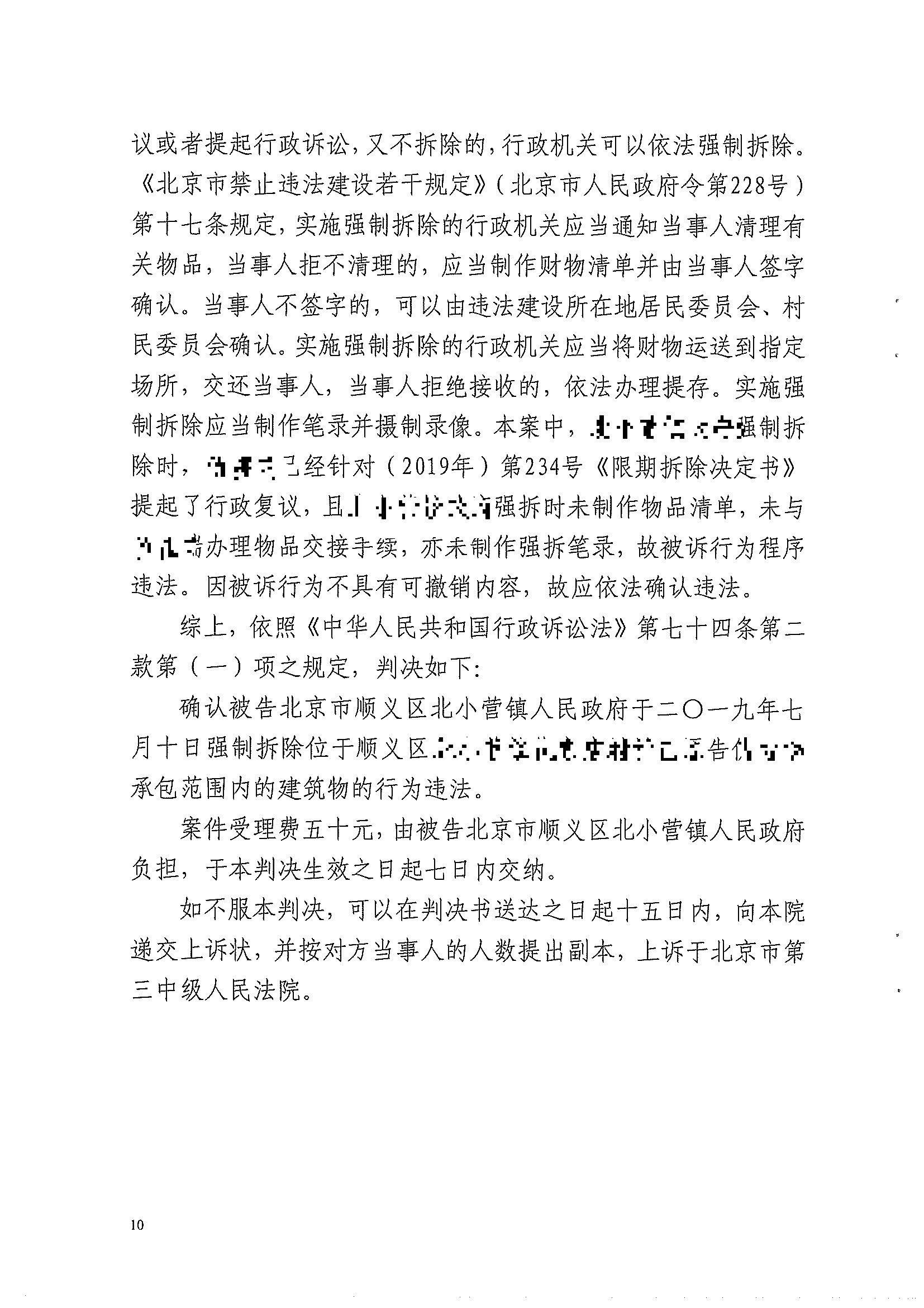 对于我方的主张,法院予以认可。判决如下:确认被告强制拆除的行为违法。