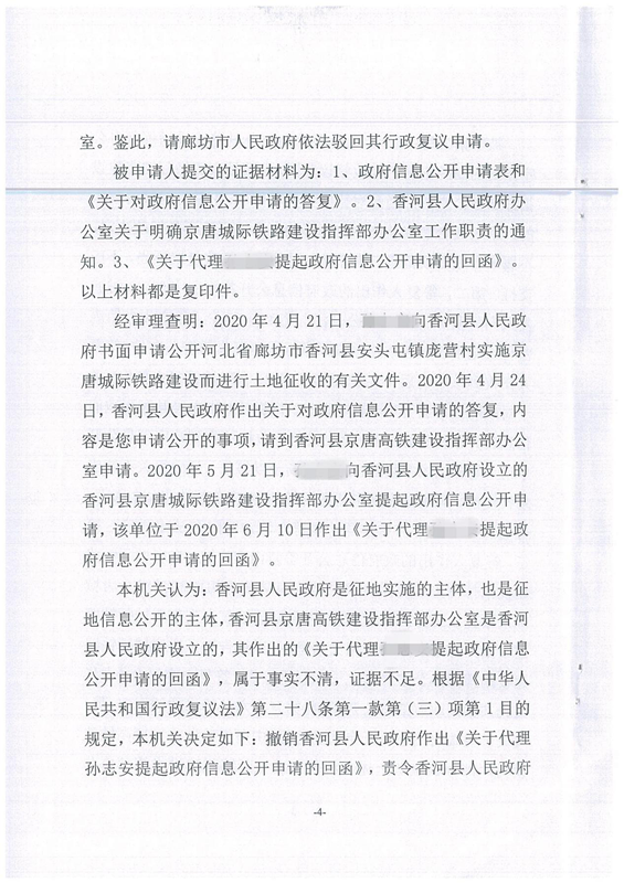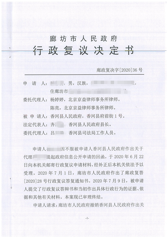 在接到委托之后,德凯律师团委派了杨婷婷、陈亮律师承办此案。在研究了案件情况之后,首先决定先对案件情况进行取证,申请公开“征收土地公告”“征地补偿补助费用的发放及使用情况”“征收补偿方案”“收受补偿工作的实施意见”四项政府信息,但被申请人并未依法公开上述四项政府信息。两位律师随即申请了行政复议,请求复议机关撤销被申请人的政府信息公开申请回函,责令其履行法定职责。