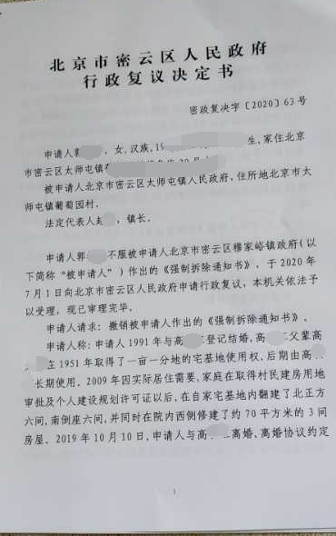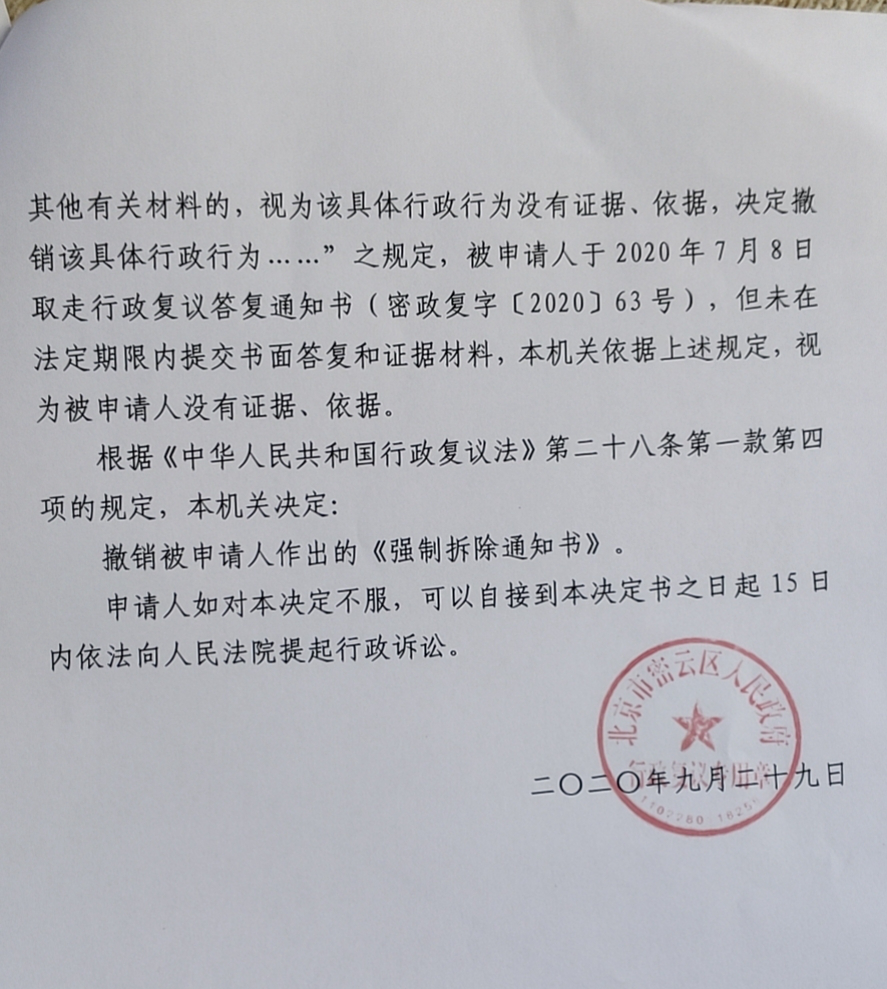 有不少朋友不信任行政复议,觉得说官官相护,上级政府肯定不会动下级政府的决定。但是北京市密云区的复议决定对于这种说法无疑是有力的回击。行政复议,在征地拆迁过程中是非常重要的一个环节,被征收人如果认为征收决定、强拆房屋、征地批复、补偿决定等具体行政行为不合法,都可以申请行政复议,来维护自己的权益,而且也可以通过行政复议,让政府向征收部门施加压力,从而获取自己的合理补偿。