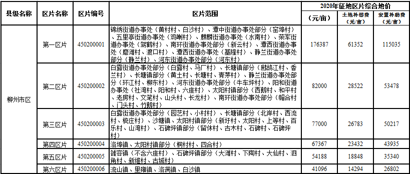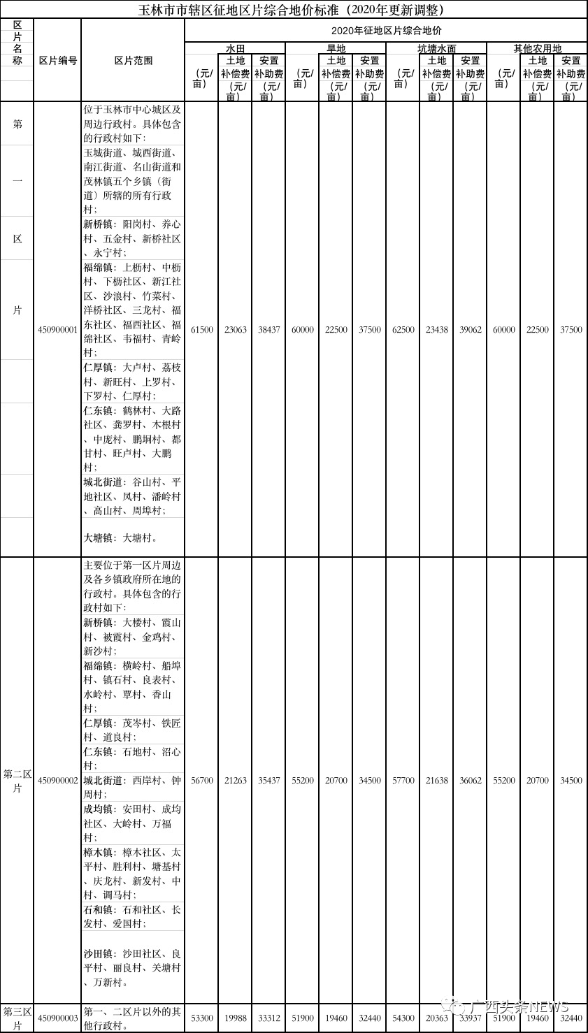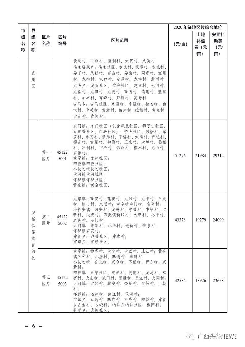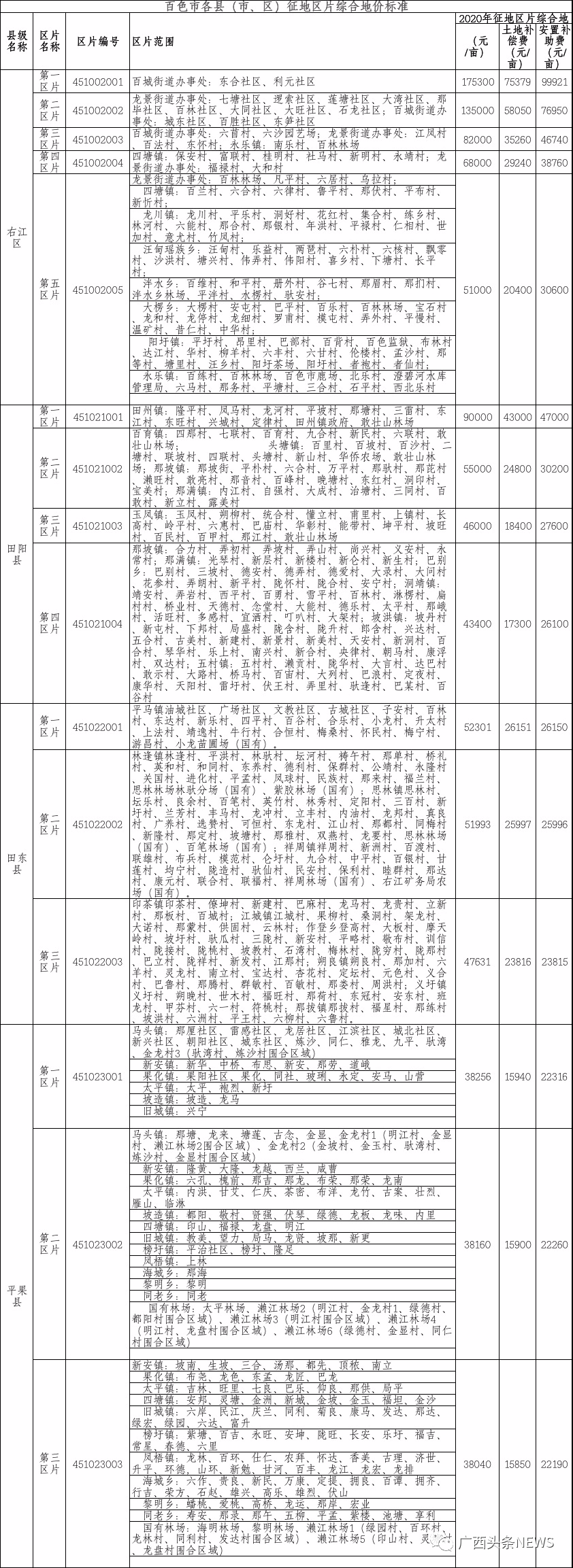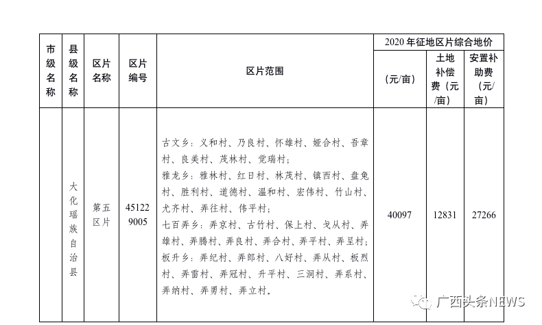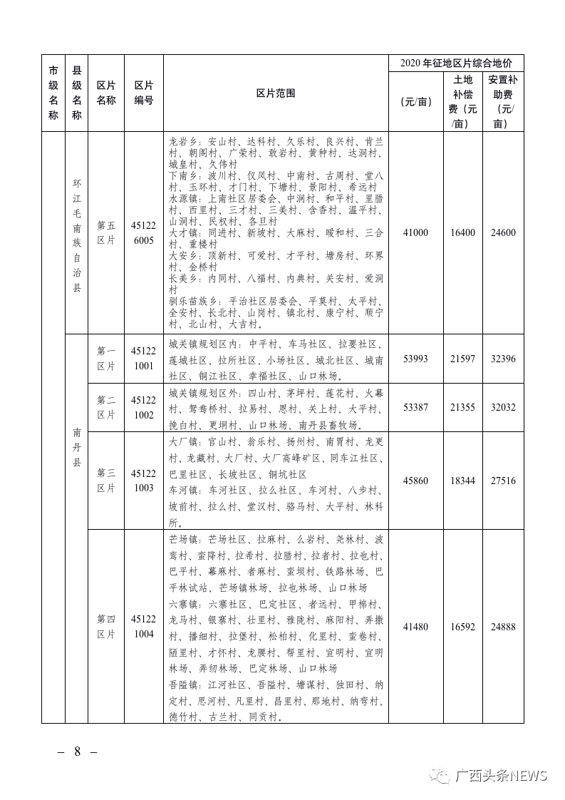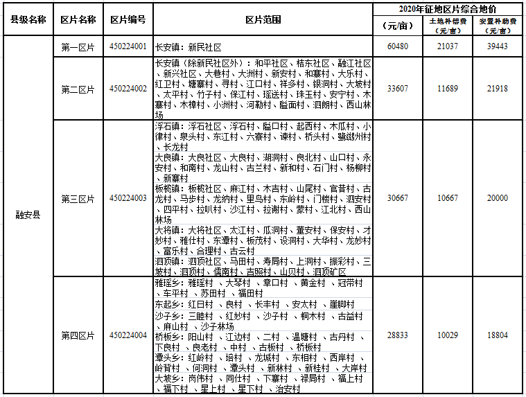 今年3月,自治区创新出台《关于实施征地区片综合地价的通知》,在广西全面实行征地区片综合地价制度,依法保障被征地农民合法权益。本轮更新调整后,全区征地补偿标准平均水平为44269元/亩,与现行补偿标准相比(42916元/亩)上调了1353元/亩,平均上调幅度3.15%,遵循了新旧成果平稳过渡、略有提高的原则。上述《通知》自2020年1月1日开始实施,原征地统一年产值补偿标准同时停止执行。今后,广西将根据经济社会发展情况,对征地区片综合地价标准至少每三年调整或者重新公布一次。