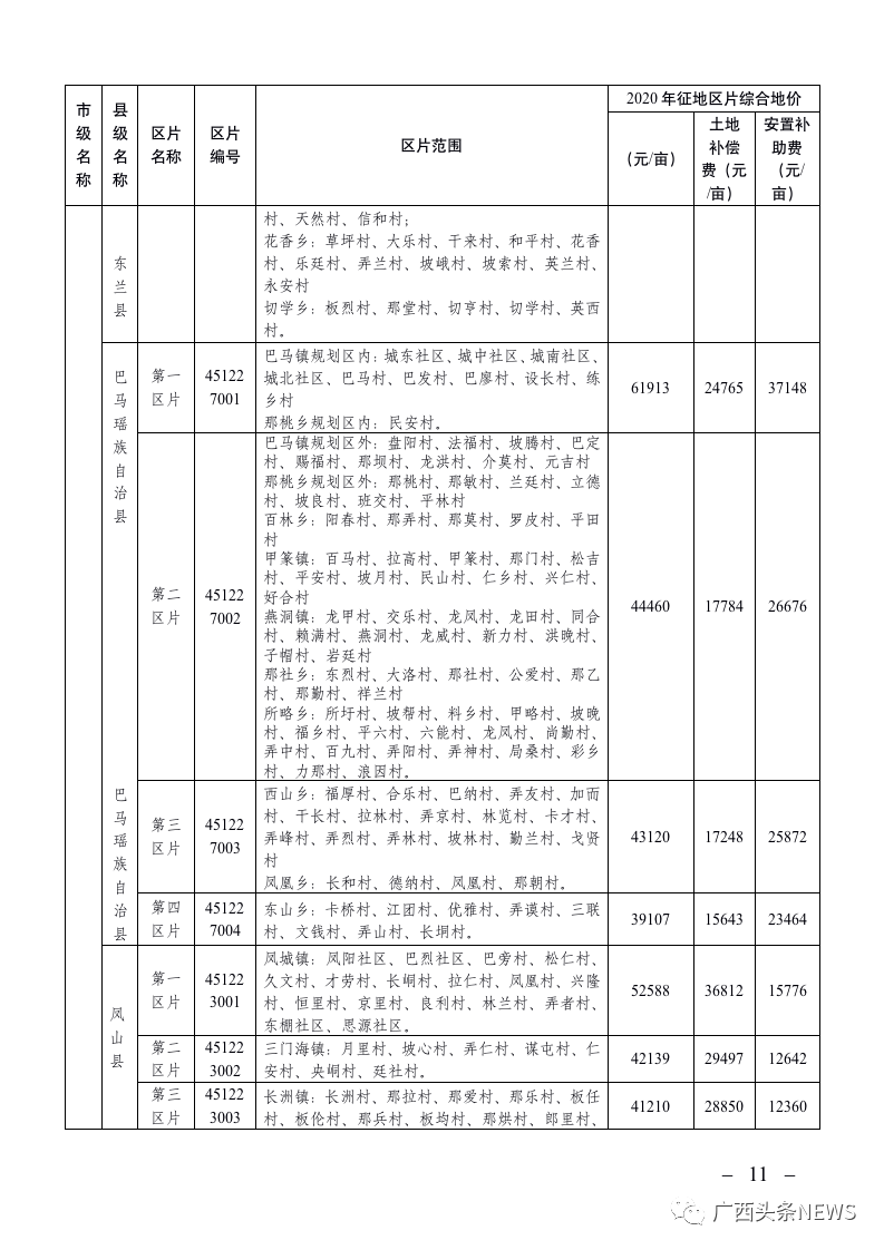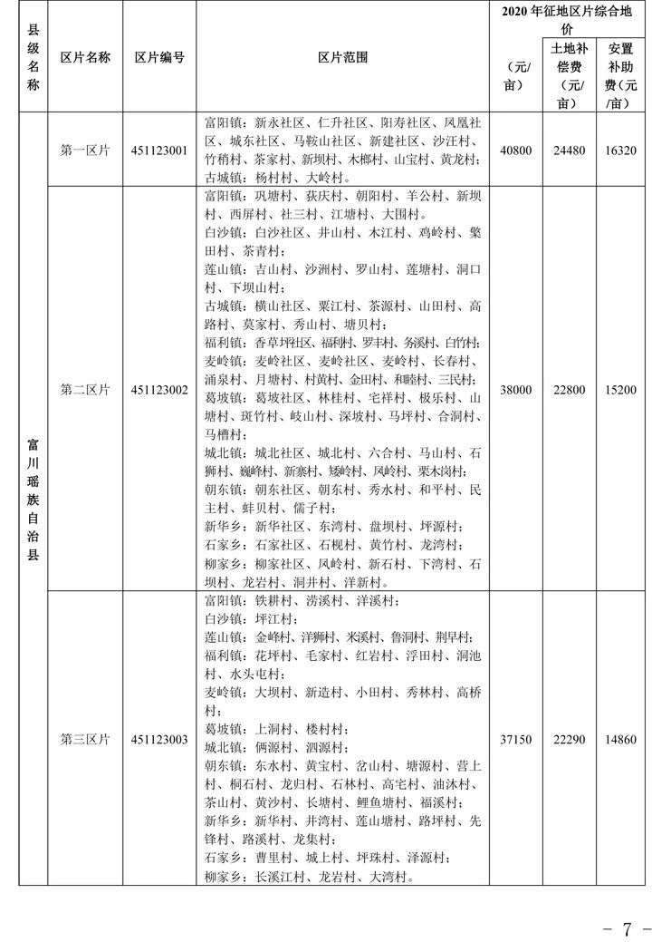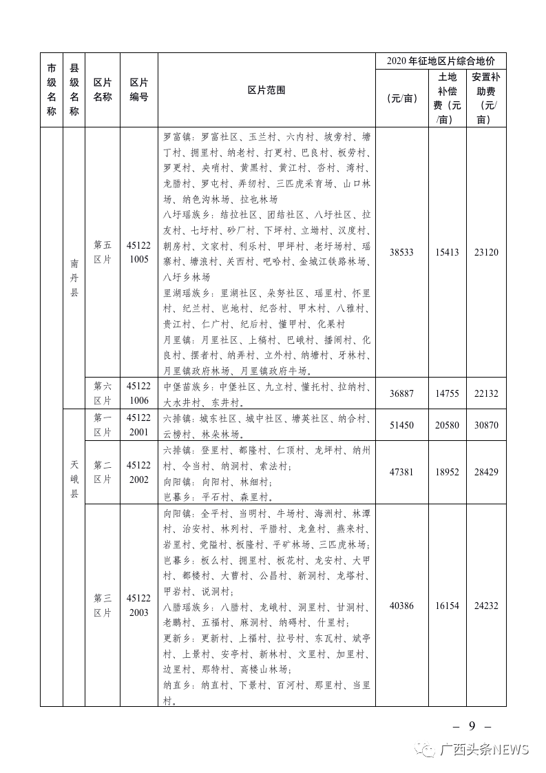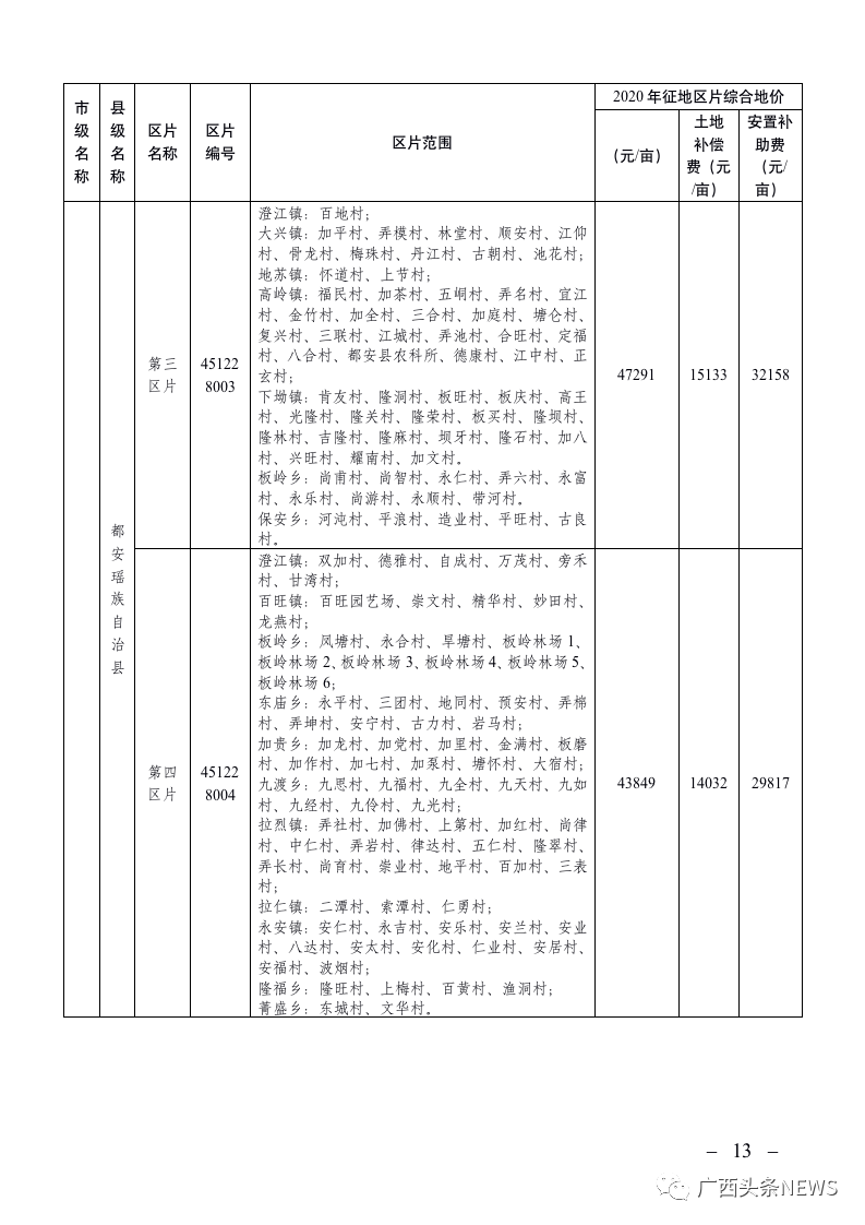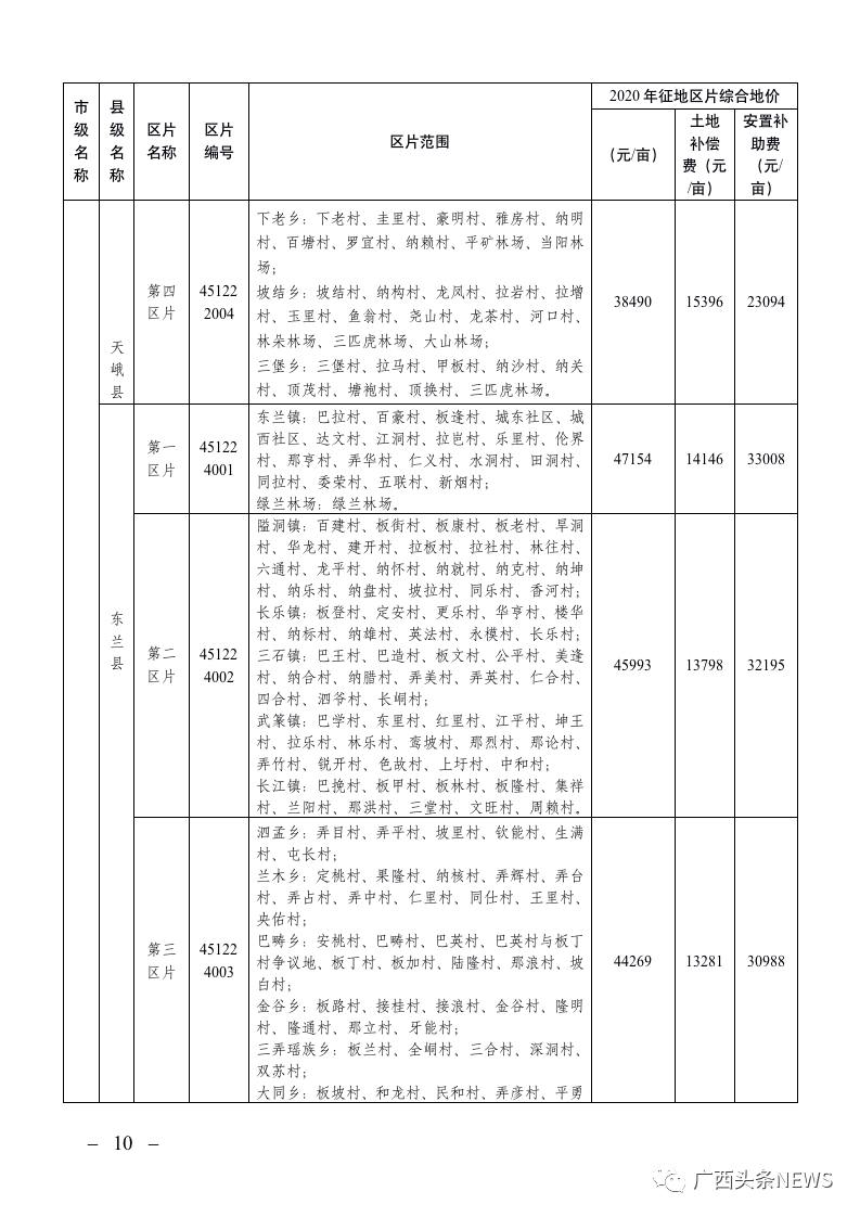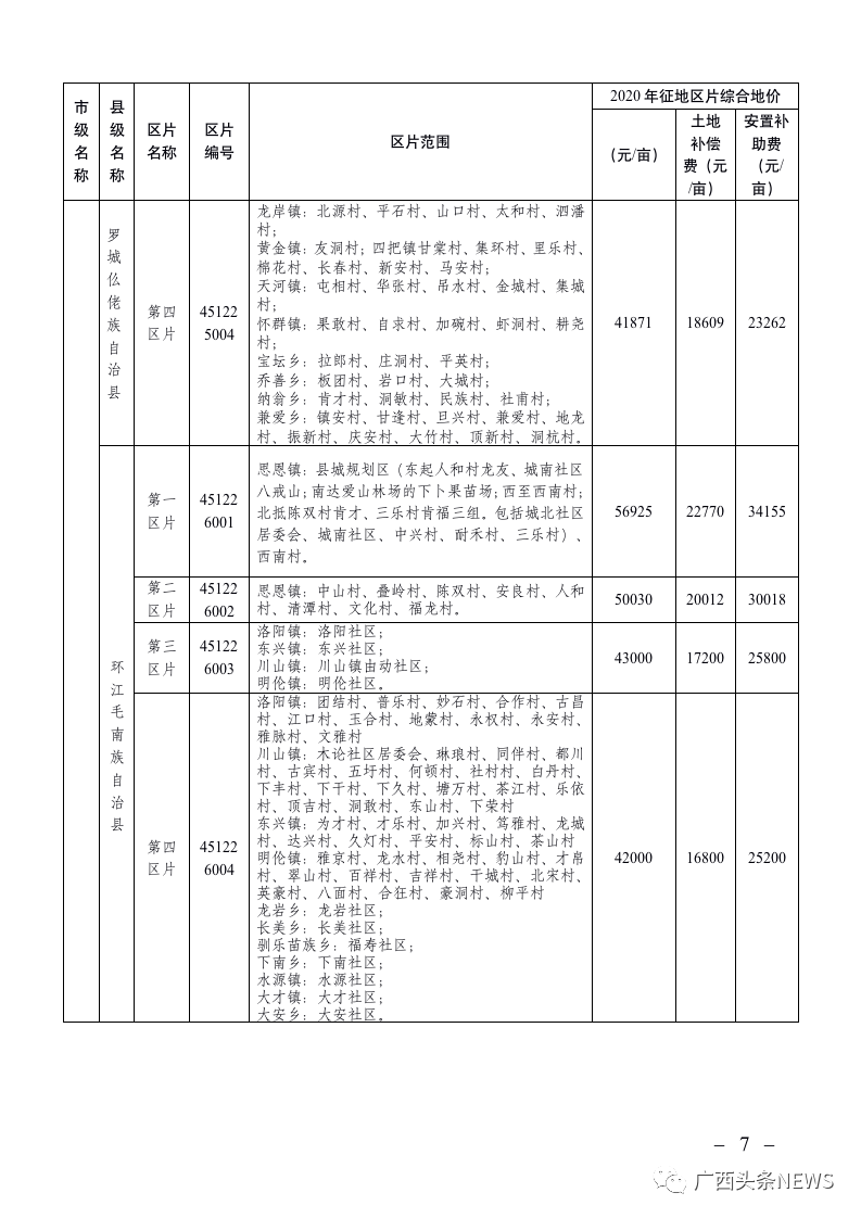 今年3月,自治区创新出台《关于实施征地区片综合地价的通知》,在广西全面实行征地区片综合地价制度,依法保障被征地农民合法权益。本轮更新调整后,全区征地补偿标准平均水平为44269元/亩,与现行补偿标准相比(42916元/亩)上调了1353元/亩,平均上调幅度3.15%,遵循了新旧成果平稳过渡、略有提高的原则。上述《通知》自2020年1月1日开始实施,原征地统一年产值补偿标准同时停止执行。今后,广西将根据经济社会发展情况,对征地区片综合地价标准至少每三年调整或者重新公布一次。