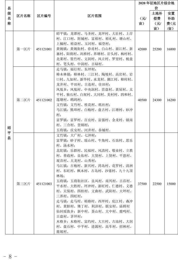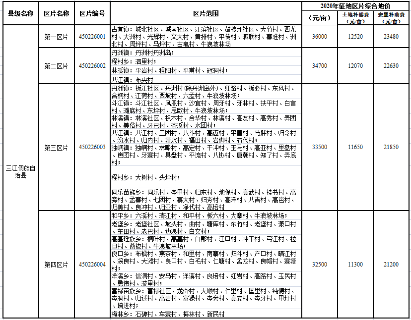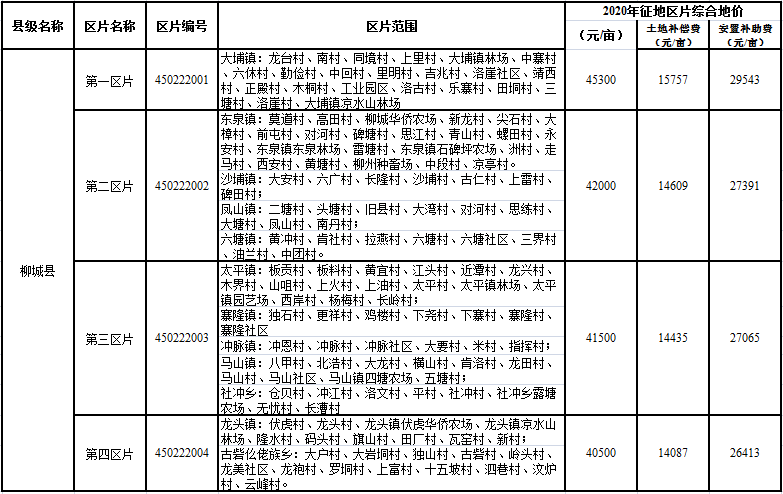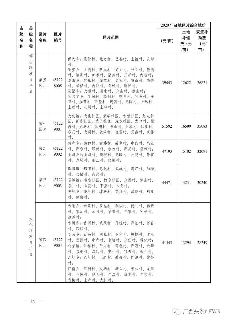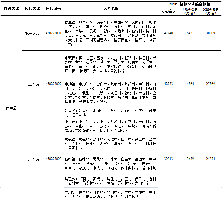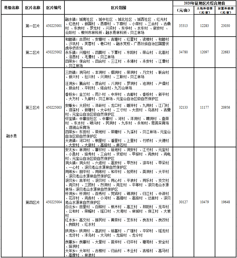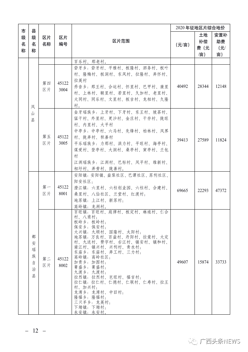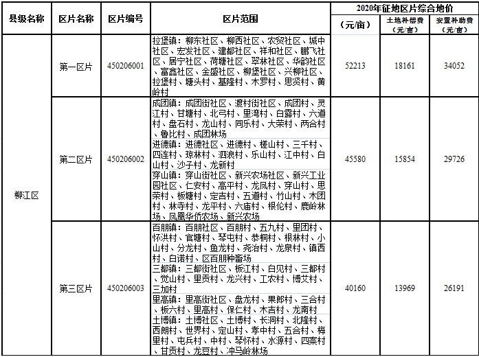 今年3月,自治区创新出台《关于实施征地区片综合地价的通知》,在广西全面实行征地区片综合地价制度,依法保障被征地农民合法权益。本轮更新调整后,全区征地补偿标准平均水平为44269元/亩,与现行补偿标准相比(42916元/亩)上调了1353元/亩,平均上调幅度3.15%,遵循了新旧成果平稳过渡、略有提高的原则。上述《通知》自2020年1月1日开始实施,原征地统一年产值补偿标准同时停止执行。今后,广西将根据经济社会发展情况,对征地区片综合地价标准至少每三年调整或者重新公布一次。