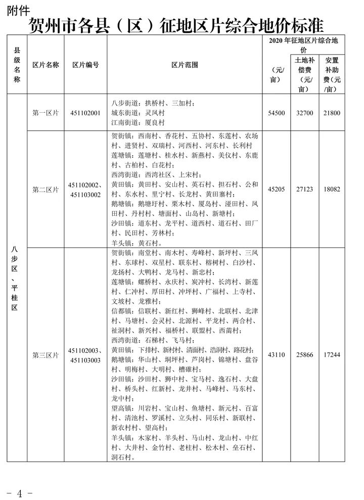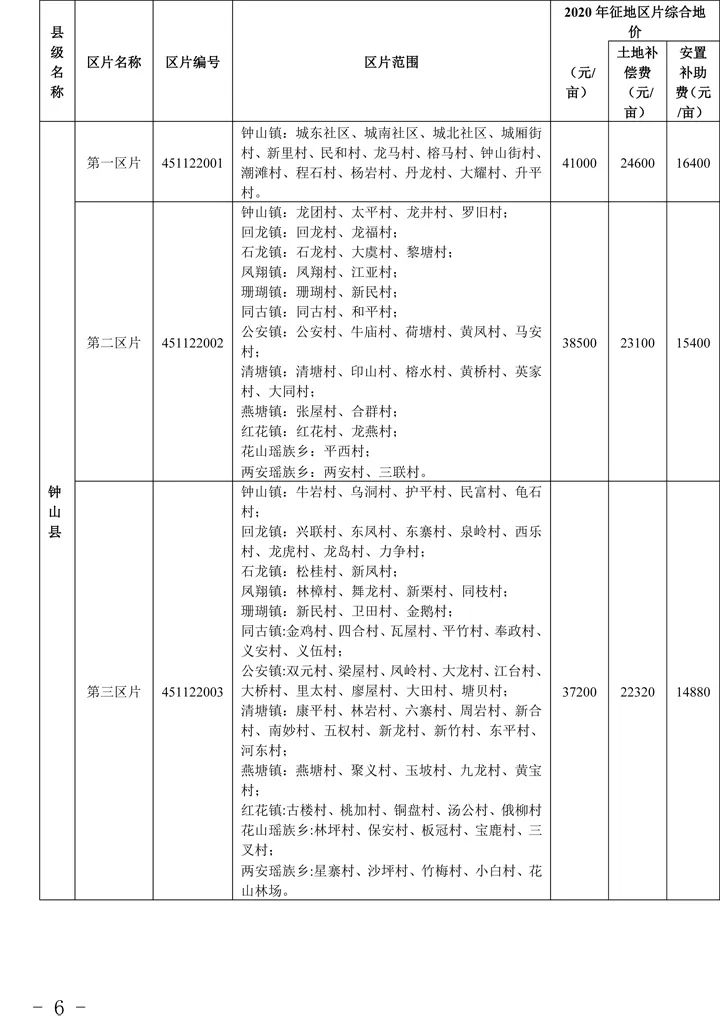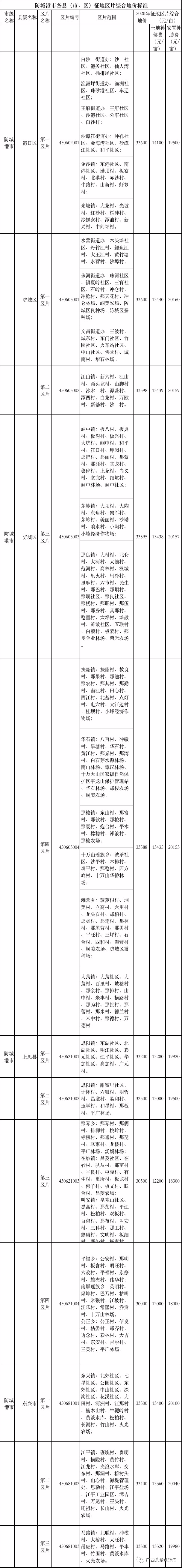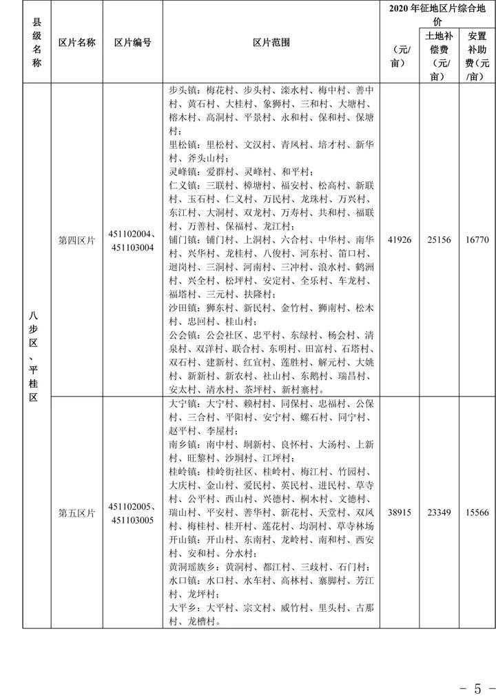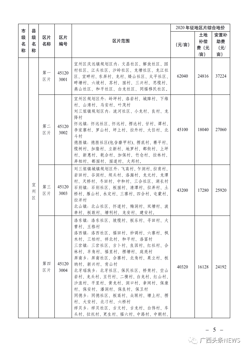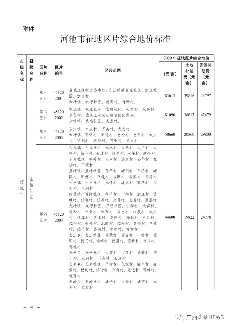 今年3月,自治区创新出台《关于实施征地区片综合地价的通知》,在广西全面实行征地区片综合地价制度,依法保障被征地农民合法权益。本轮更新调整后,全区征地补偿标准平均水平为44269元/亩,与现行补偿标准相比(42916元/亩)上调了1353元/亩,平均上调幅度3.15%,遵循了新旧成果平稳过渡、略有提高的原则。上述《通知》自2020年1月1日开始实施,原征地统一年产值补偿标准同时停止执行。今后,广西将根据经济社会发展情况,对征地区片综合地价标准至少每三年调整或者重新公布一次。