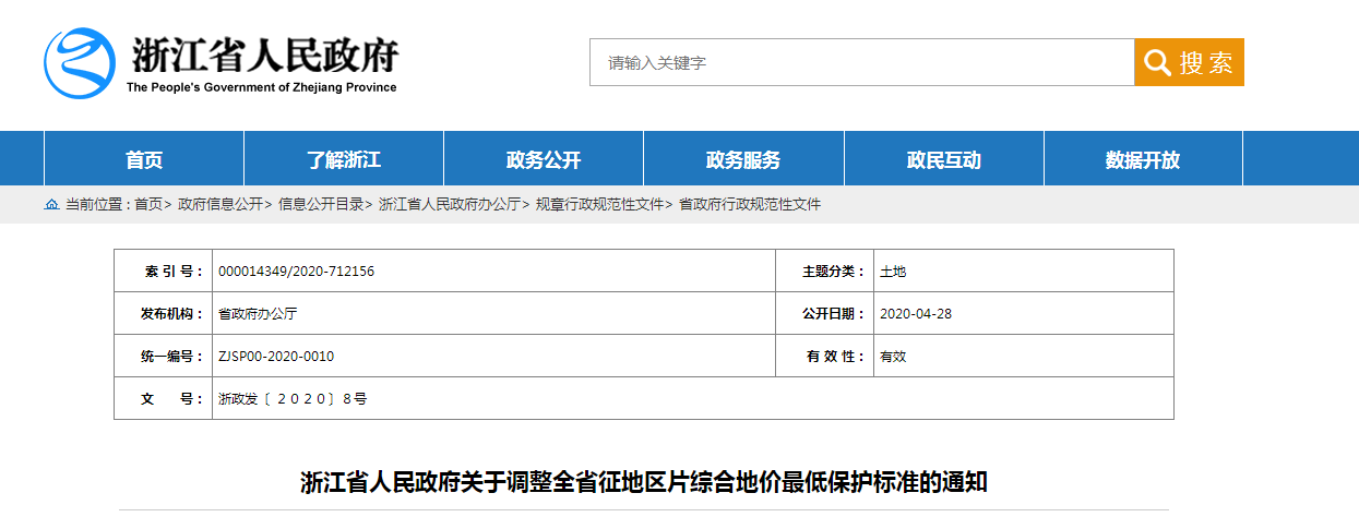 本通知自发布之日起施行,有效期4年。《浙江省国土资源厅关于重新公布全省征地补偿最低保护标准的通知》(浙土资发〔2017〕28号)同时废止。