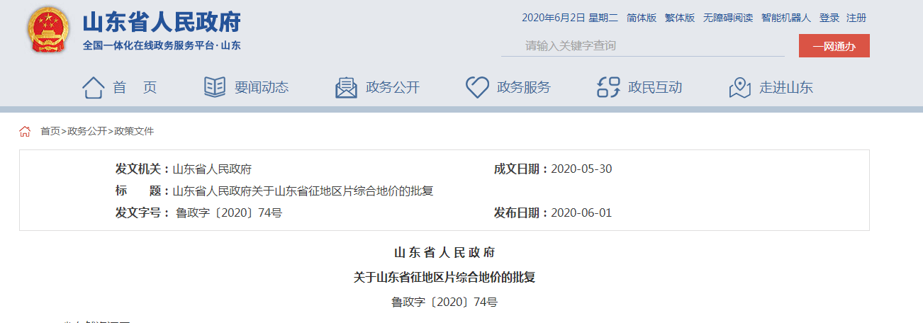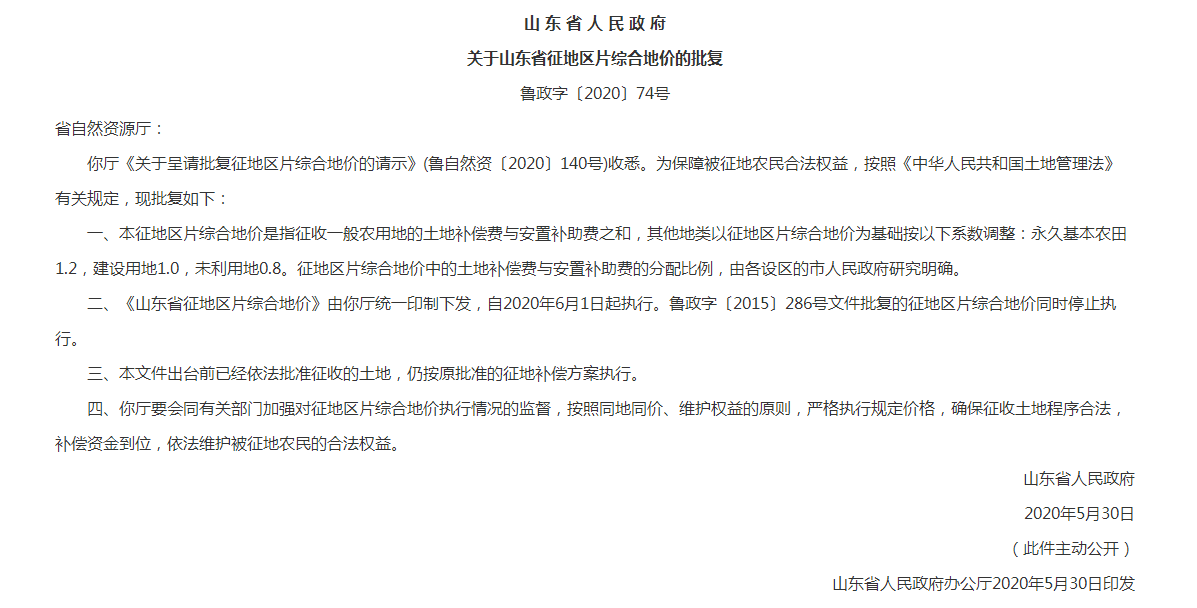 批复明确,《山东省征地区片综合地价》由省自然资源厅统一印制下发,自2020年6月1日起执行。鲁政字〔2015〕286号文件批复的征地区片综合地价同时停止执行。此外,本文件出台前已经依法批准征收的土地,仍按原批准的征地补偿方案执行。