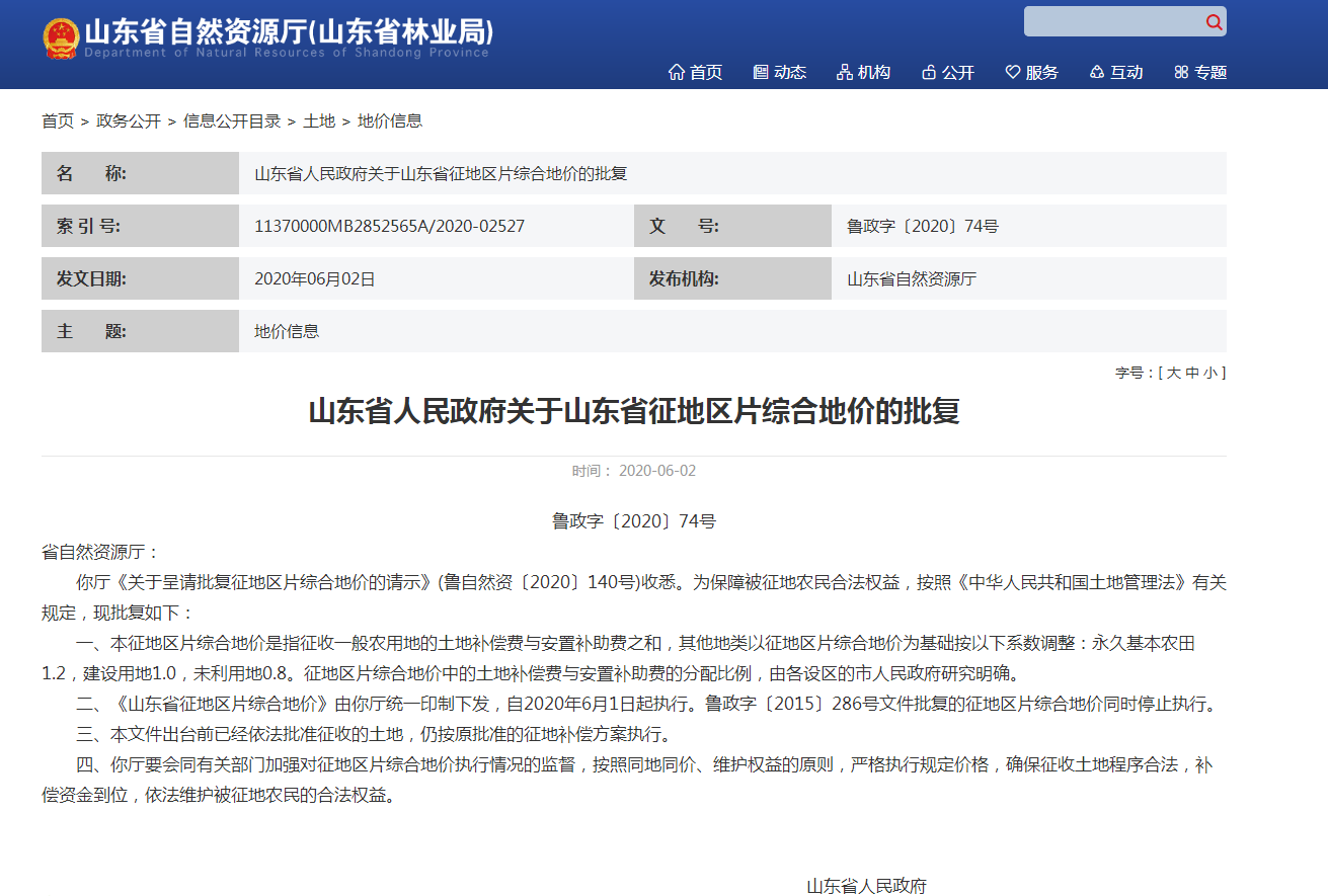 批复指出,本征地区片综合地价是指征收一般农用地的土地补偿费与安置补助费之和,其他地类以征地区片综合地价为基础按以下系数调整:永久基本农田1.2,建设用地1.0,未利用地0.8。征地区片综合地价中的土地补偿费与安置补助费的分配比例,由各设区的市人民政府研究明确。批复明确,《山东省征地区片综合地价》由省自然资源厅统一印制下发,自2020年6月1日起执行。鲁政字〔2015〕286号文件批复的征地区片综合地价同时停止执行。此外,本文件出台前已经依法批准征收的土地,仍按原批准的征地补偿方案执行。批复强调,省自然资源厅要会同有关部门加强对征地区片综合地价执行情况的监督,按照同地同价、维护权益的原则,严格执行规定价格,确保征收土地程序合法,补偿资金到位,依法维护被征地农民的合法权益。如果您收到的征地标准还是按照2015年的标准施行,那您可要注意了!小心您的合法权益正遭到侵害,建议您及时咨询专业的征地拆迁律师。