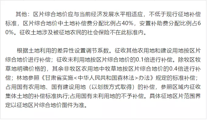 一、《甘肃省征收农用地区片综合地价标准》于2020年1月1日起实施。2020年1月1日以来,已组织征地报批的,按新标准征收;在此之前已取得用地批复但尚未开展征地工作的,亦按新标准征收。2017年2月19日印发的《甘肃省征地补偿区片综合地价及甘肃省征地补偿统一年产值标准》(甘政发〔2017〕17号)废止。