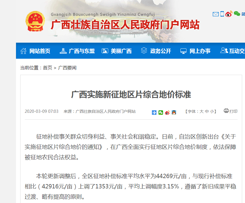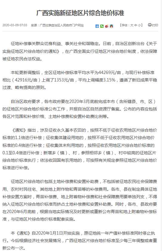 据悉,广西今后将根据经济社会发展情况,至少每3年调整或重新公布一次征地区片综合地价标准。