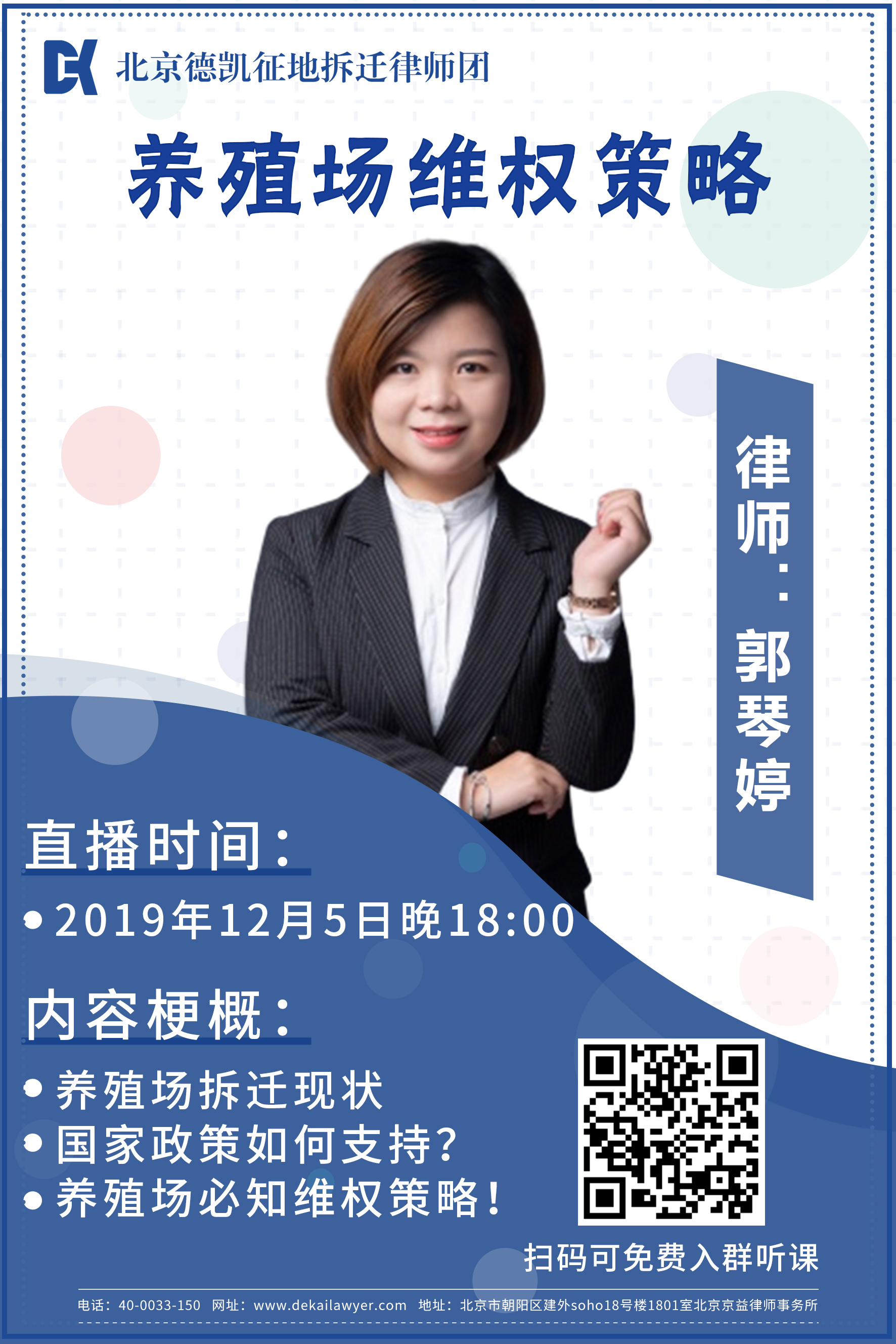 北京德凯律师团骨干律师/普法维权高级讲师郭琴婷律师将在12月5日18:00于【德凯征地拆迁全国经验交流群】内开展语音直播授课,以及实时语音解答!希望以我们的专业知识服务于广大被拆迁户们!