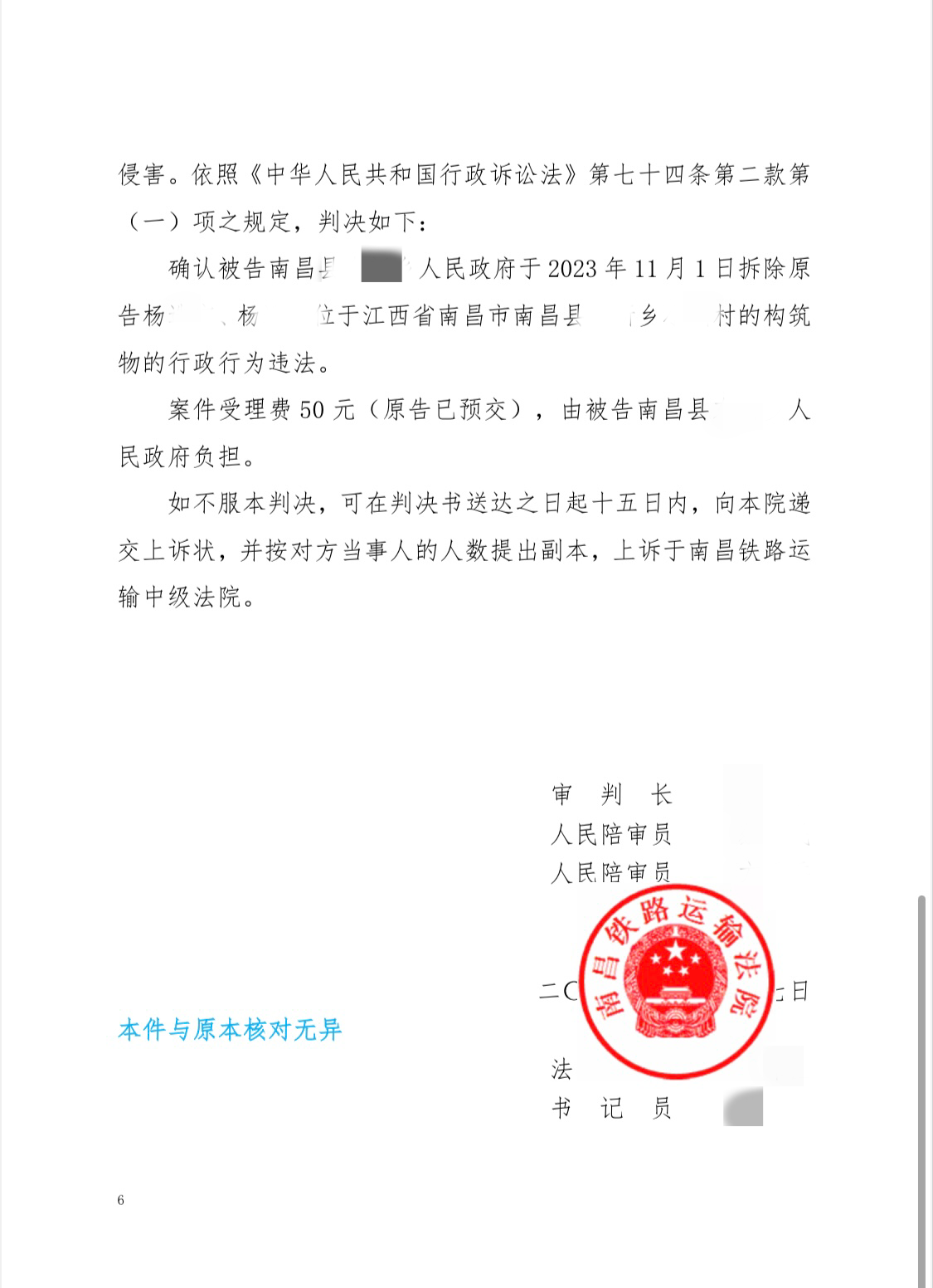确认被告XX乡人民政府于2023年11月1日拆除原告杨某二人位于江西省南昌县XX乡XX村的构筑物的行政行为违法。