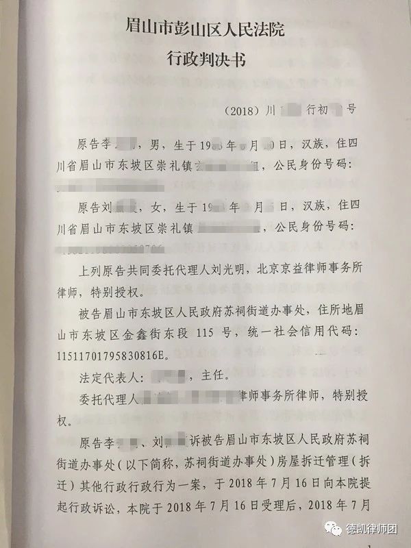 家住四川省眉山市东坡区崇礼镇的李先生、刘女士,2012年通过合法手续购买一处坐落于东坡区的房屋,后依法办理并取得了房屋所有权证书,2018年2月,在李先生和刘女士外出务工期间,房屋被眉山市东坡区人民政府苏祠街道办事处全部强制拆除,房屋及屋内物品全部毁于一旦。求助无门的情况下,李先生想起了自己之前和德凯律师团在微信上有过沟通,于是经过再次和德凯律师团联系后,将案件委托给德凯律师团代为维权。