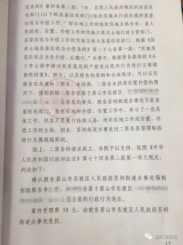 经过法院对案件的详细梳理以及争议焦点的查明与认定,李先生、刘女士的请求成立,得到法院的支持。确认眉山市东坡区人民政府苏祠街道办事处于2018年2月强制拆除原告坐落于东坡区李先生房屋的行政行为违法,并且案件受理费由被告承担。