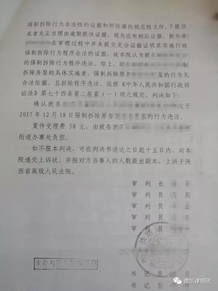 最终法院根据《行政强制法》第十八条规定:“行政机关实施行政强制措施应当遵守下列规定:(二)由两名以上行政执法人员实施;(三)出示执法身份证件;(四)通知当事人到场;(五)当场告知当事人采取行政强制措施的理由、依据以及当事人依法享有的权利、救济途径;(六)听取当事人的陈述和申辩;(七)制作现场笔录;(八)现场笔录有当事人和行政执法人员签名或者盖章,当事人拒绝的,在笔录中予以注明;(九)当事人不到场的,邀请见证人到场,由见证人和行政执法人员在现场笔录上签名或者盖章;........”以及《行政诉讼法》中相关举证证明责任的规定判决被告强拆的行政行为违法。