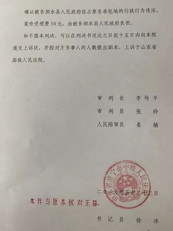 果不其然,济宁市中级人民法院认为案件的焦点就是起诉期限以及强征主体的确定和强征行为是否违法。经过公正的审理,最后判决确认泗水县人民政府征占原告承包地的行政行为违法,并由泗水县人民政府承担案件的受理费。