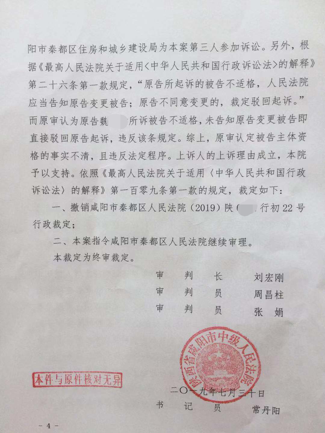 1、撤销咸阳市秦都区人民法院(2019)陕0402行初22号行政裁定;