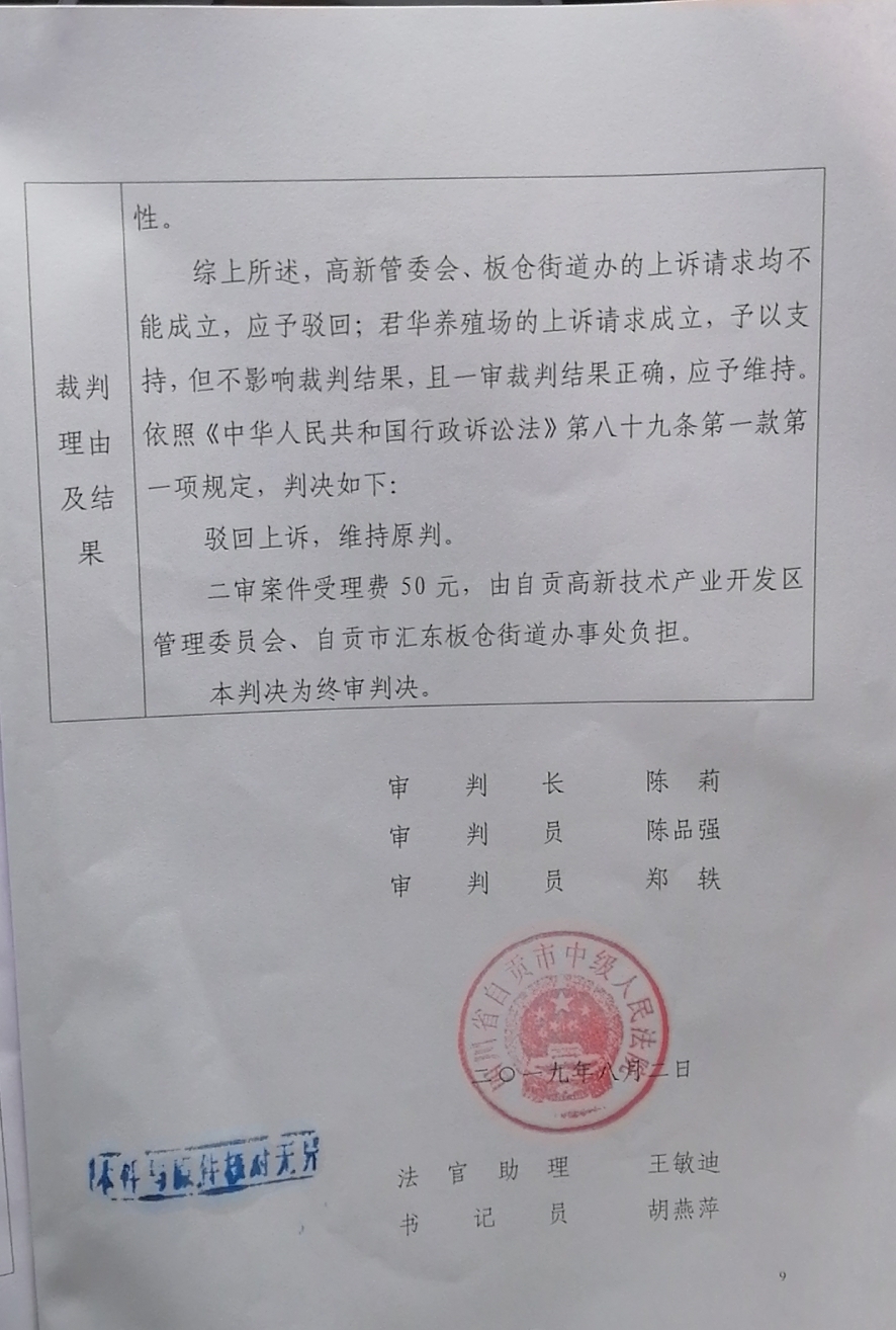 高新管委会、板仓街道办的上诉请求均不能成立,应予驳回;君华养殖场的上诉请求成立,予以支持,但不影响裁判结果,且一审裁判结果正确,应予维持。依照《中华人民共和国行政诉讼法》第八十九条第一款第一项规定,判决如下: