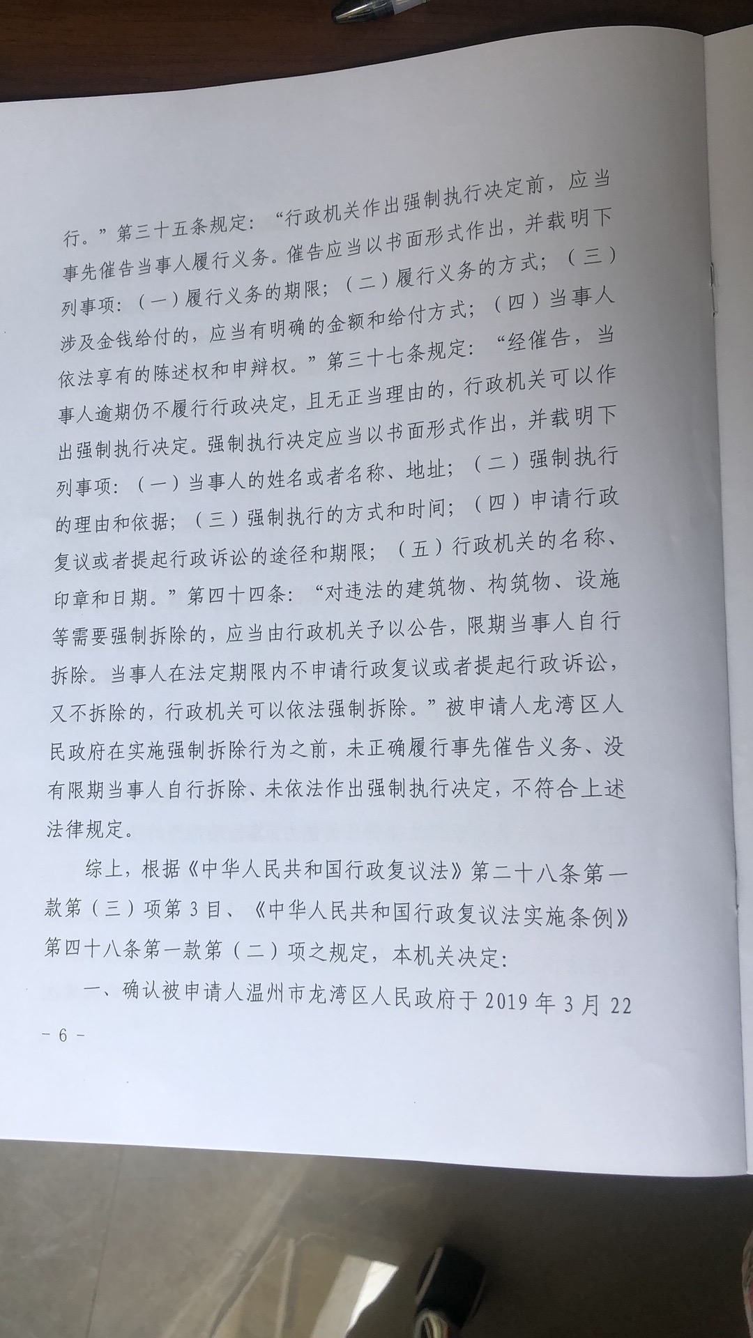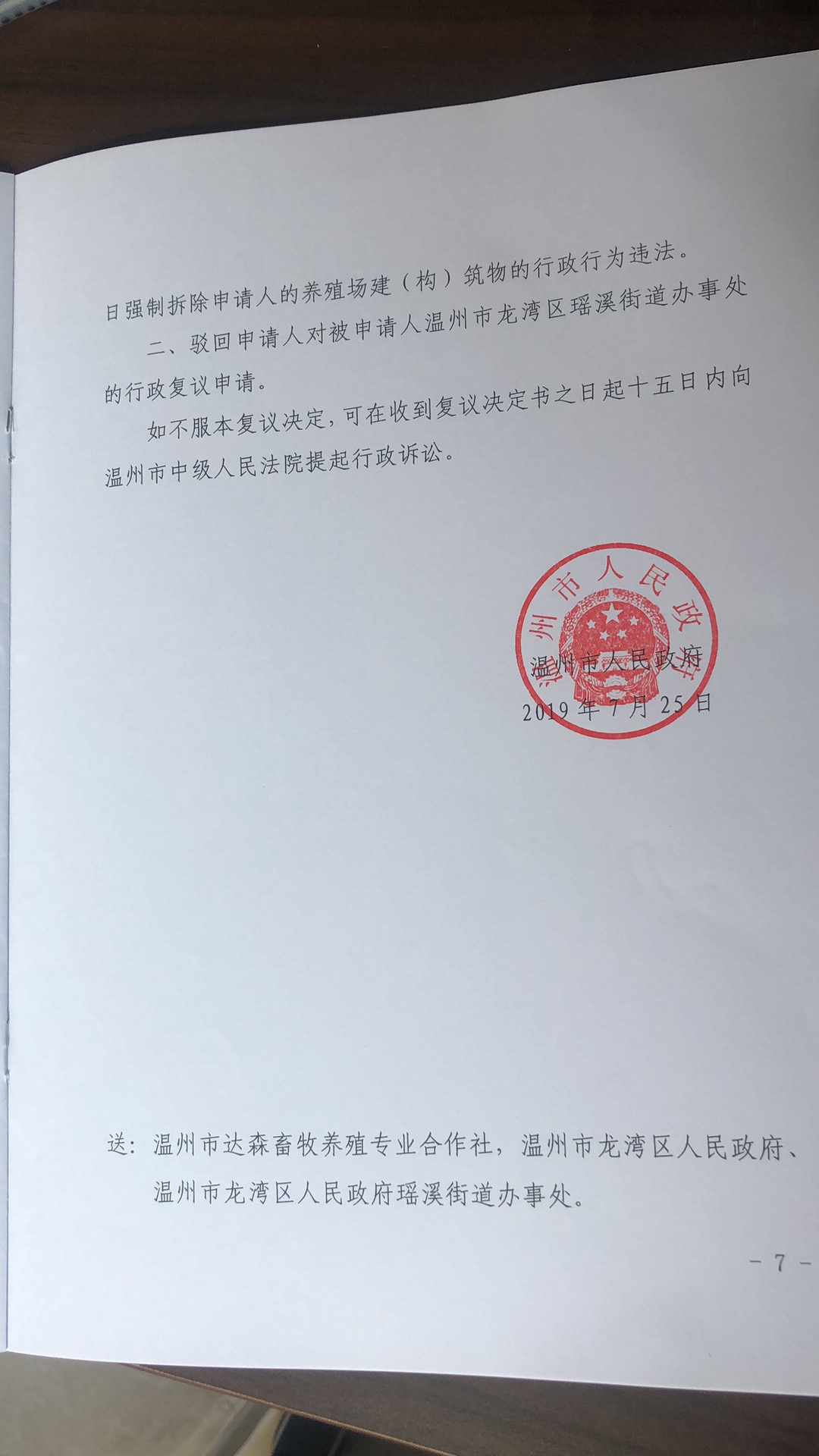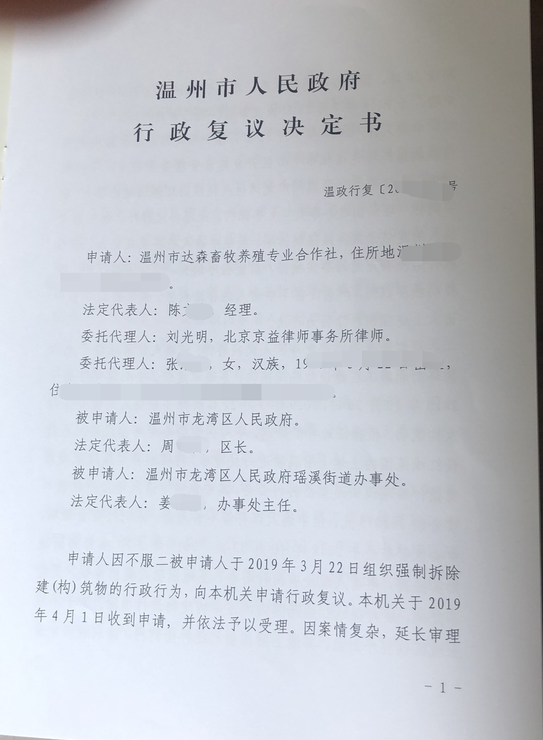 陈先生在刘光明律师的建议下毅然向温州市人民政府提出行政复议。可喜的是复议结果确定了强制拆除陈先生的养殖场建(构)筑物的行政行为违法。