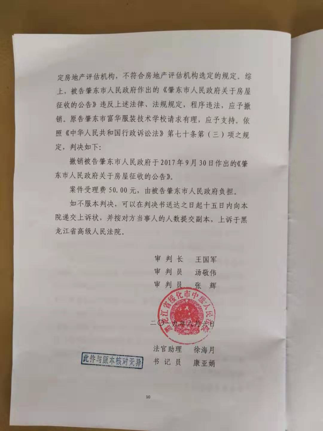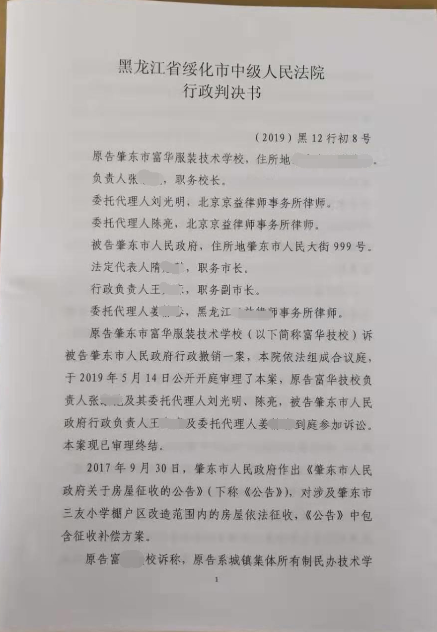 绥化市中级人民法院认为,原告肇东市富华服装技术学校系被告肇东市人民政府发布的《肇东市人民政府关于房屋征收的公告》的被征收人,是本案适格的原告。